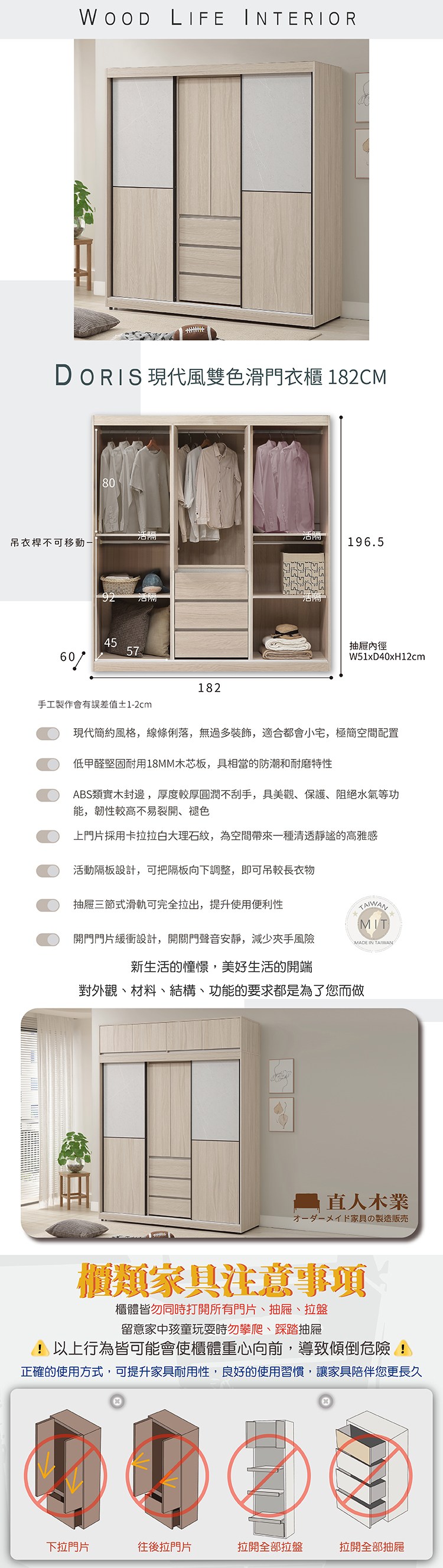 直人木業-雲白淺榆木滑門衣櫃組150公分(雙吊+三抽)