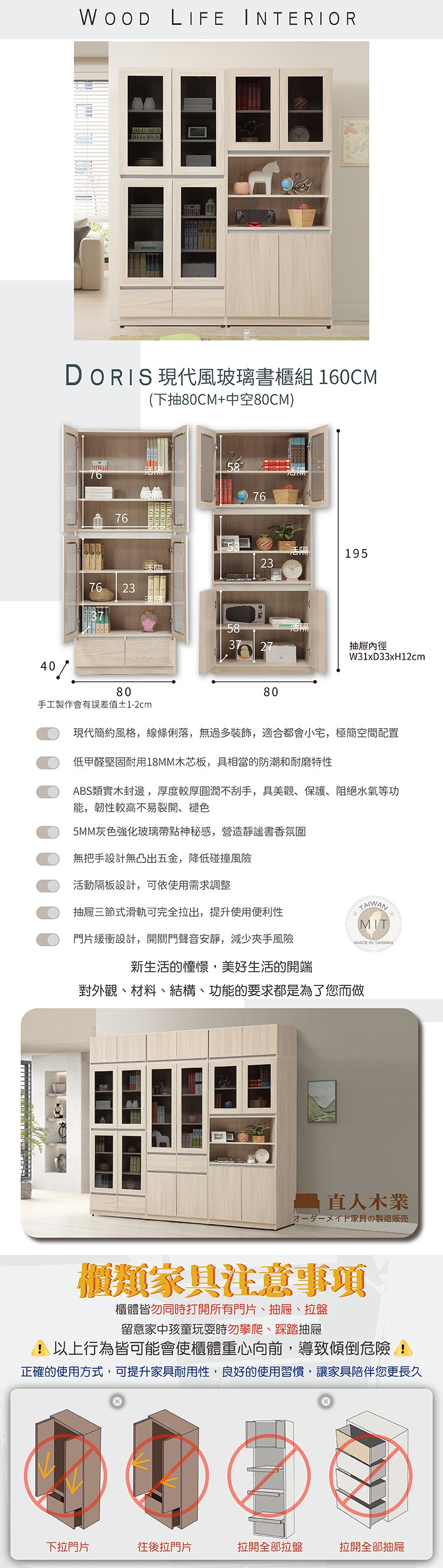 直人木業-DORIS現代風玻璃書櫃組160公分(下抽80公分+中空80公分)