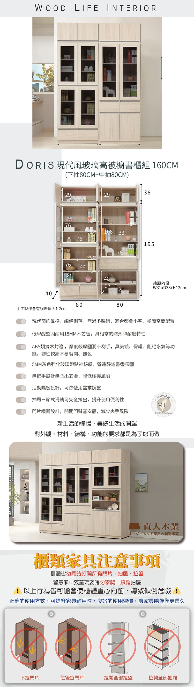 直人木業-DORIS現代風玻璃高被櫥書櫃組160公分(下抽80公分+中抽80公分)