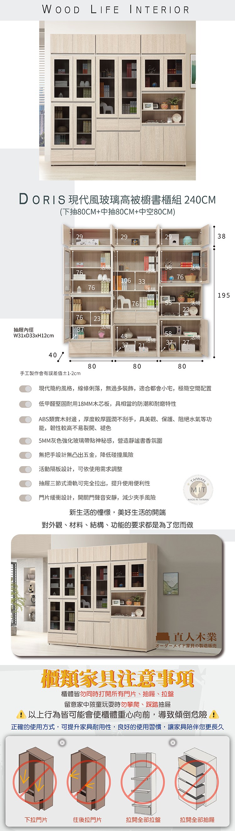 直人木業-DORIS現代風玻璃書櫃組240公分(下抽80公分+中抽80公分+中空80公分)