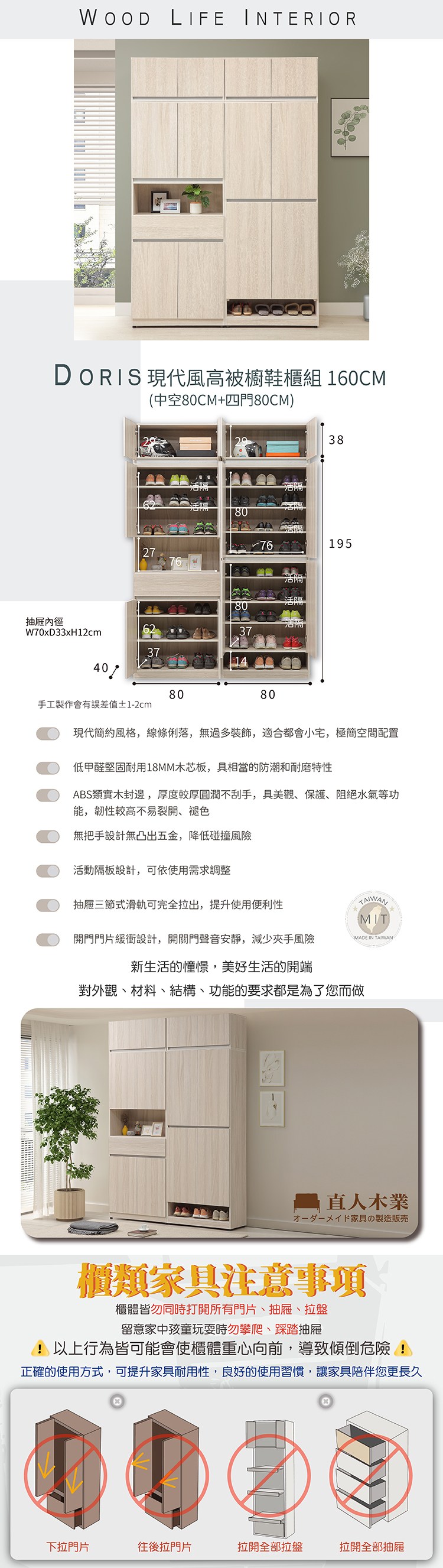 直人木業-DORIS現代風高被櫥鞋櫃組160公分(中空80公分+四門80公分)
