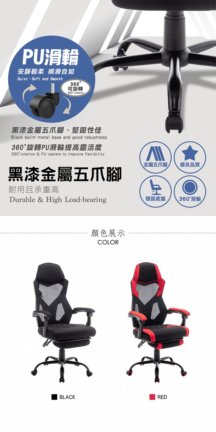 黑漆金屬五爪腳,穩固且承重強,360°旋轉靜音P.U.滑輪靈活移動,可以盡情在競速的世界征服所有挑戰。