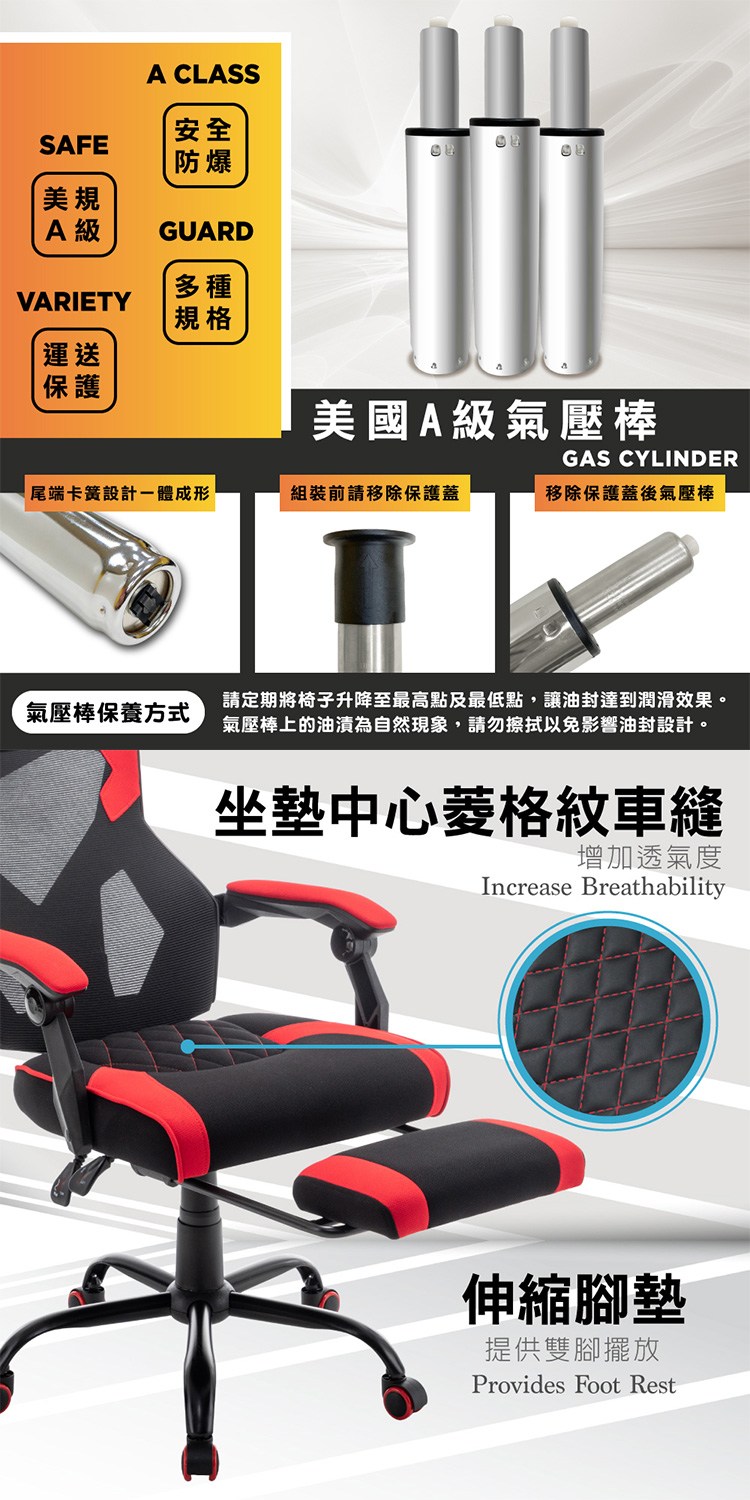 彈力布面包覆泡棉坐墊坐感舒適,獨立調整桿輕鬆控制升降、傾仰,配備美規A級氣壓棒、安全升降,