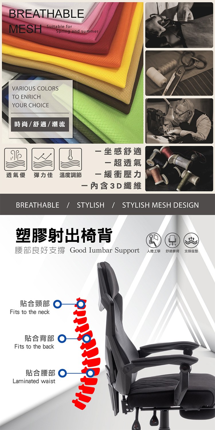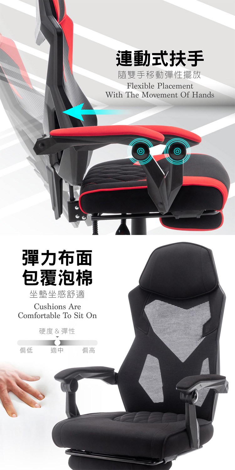 結合高透氣網布椅背,涼爽倚靠,椅背採塑膠射出、腰部良好支撐,連動式扶手隨雙手移動彈性擺放,