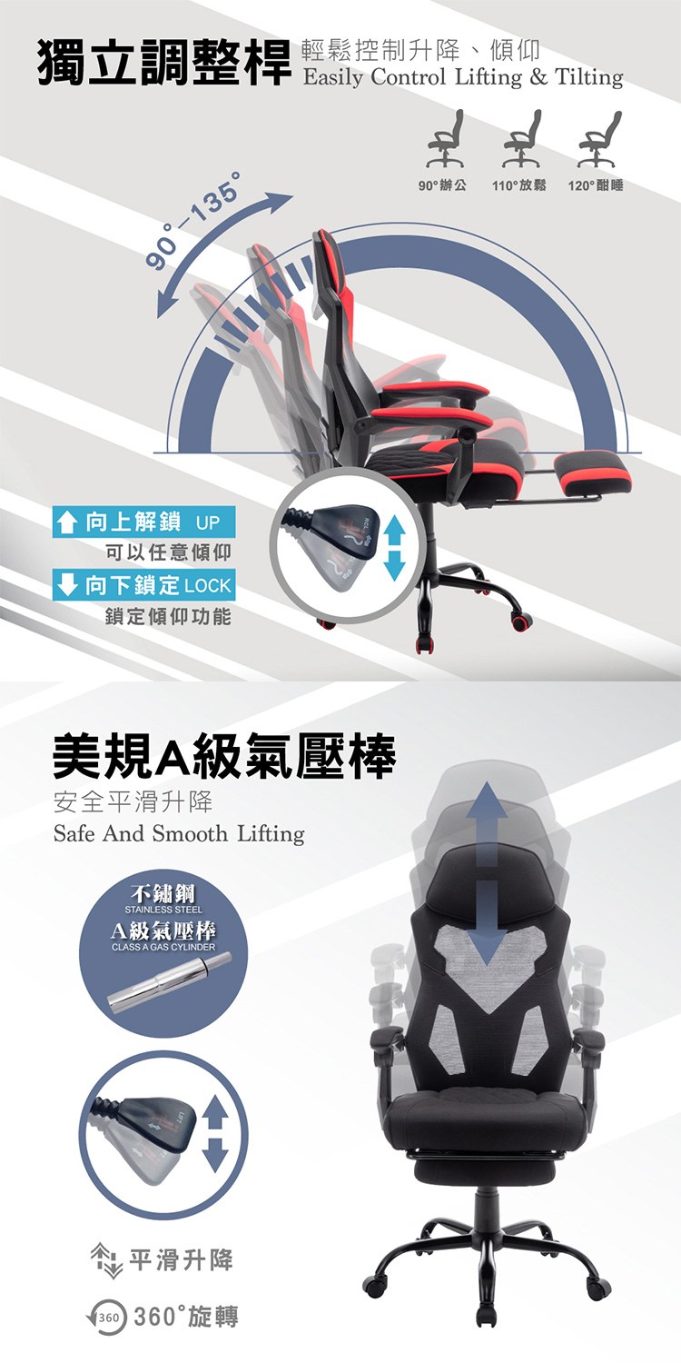 彈力布面包覆泡棉坐墊坐感舒適,獨立調整桿輕鬆控制升降、傾仰,配備美規A級氣壓棒、安全升降,