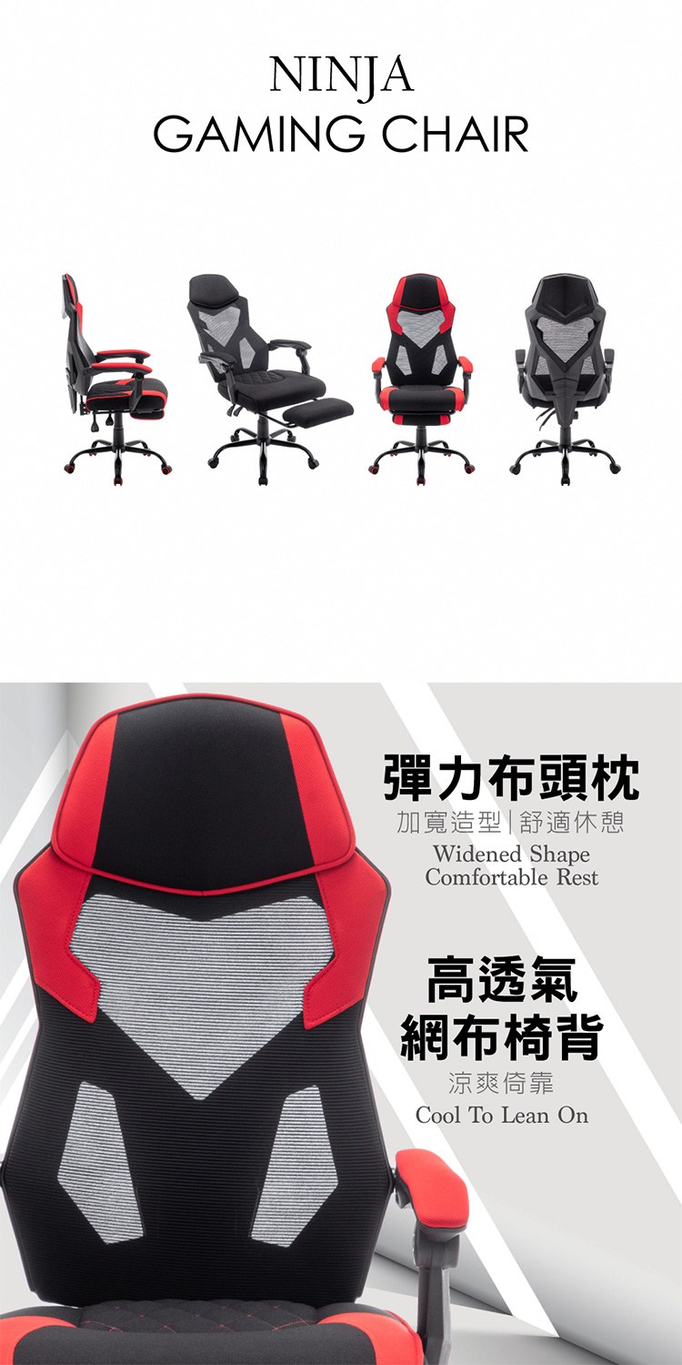 [ArcticWolf]Ninja忍者網背布面扶手含腳凳金屬腳電競椅,以賽車電競概念椅型、視覺衝擊。