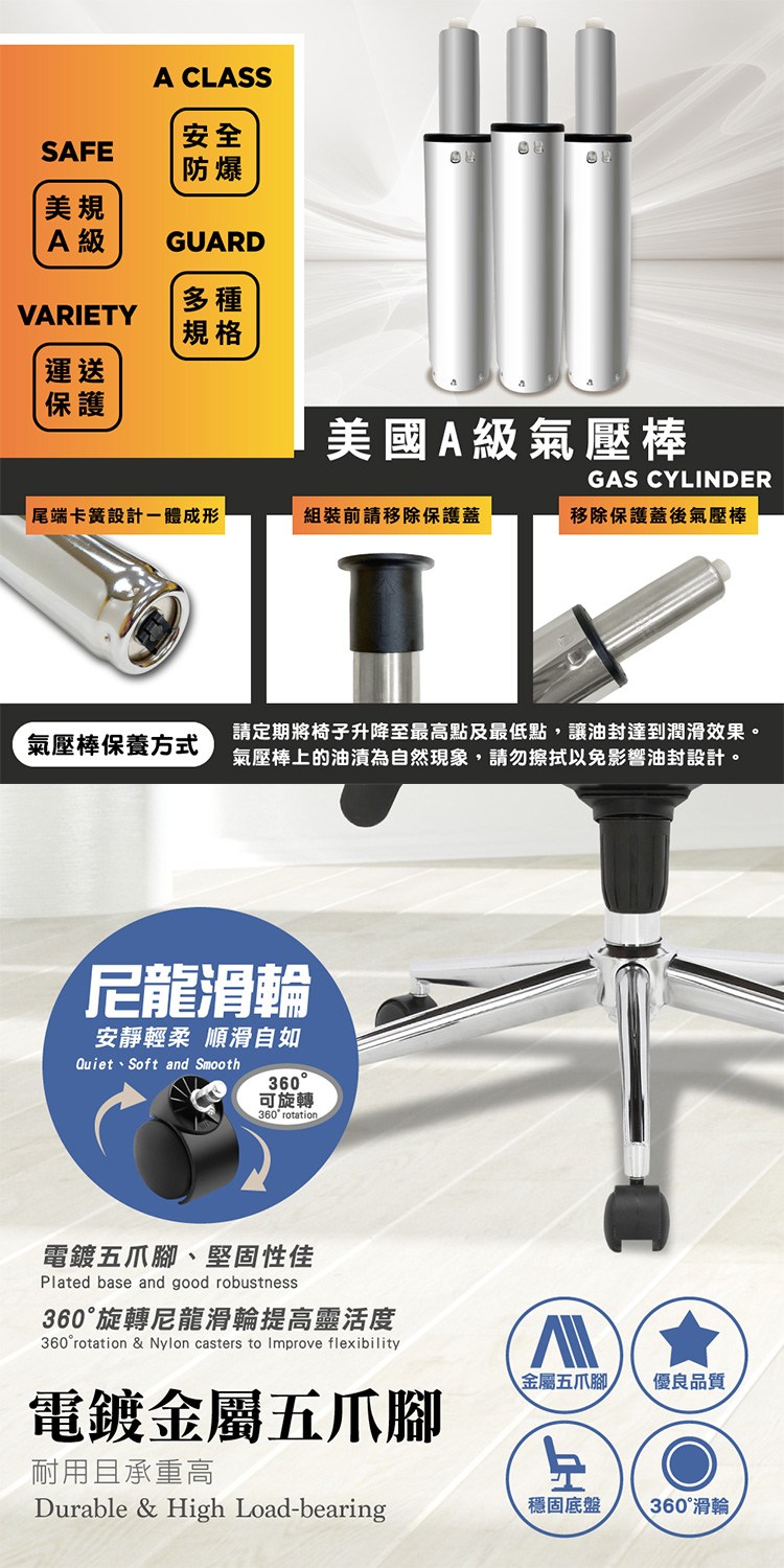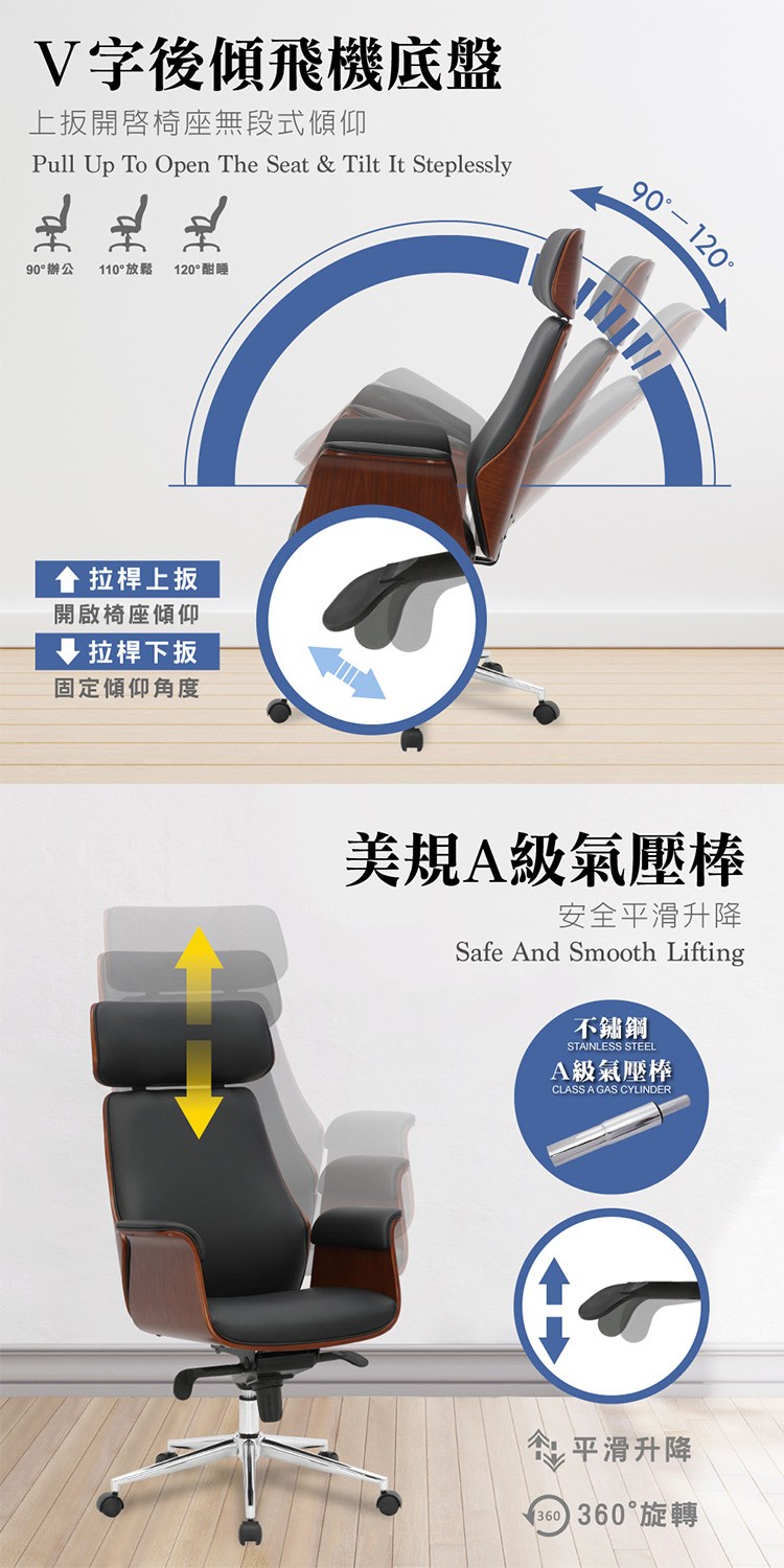 調整桿上扳開啟椅座無段式傾仰,調整桿下扳固定角度,鎖住傾仰,配備美規A級氣壓棒、安全升降,