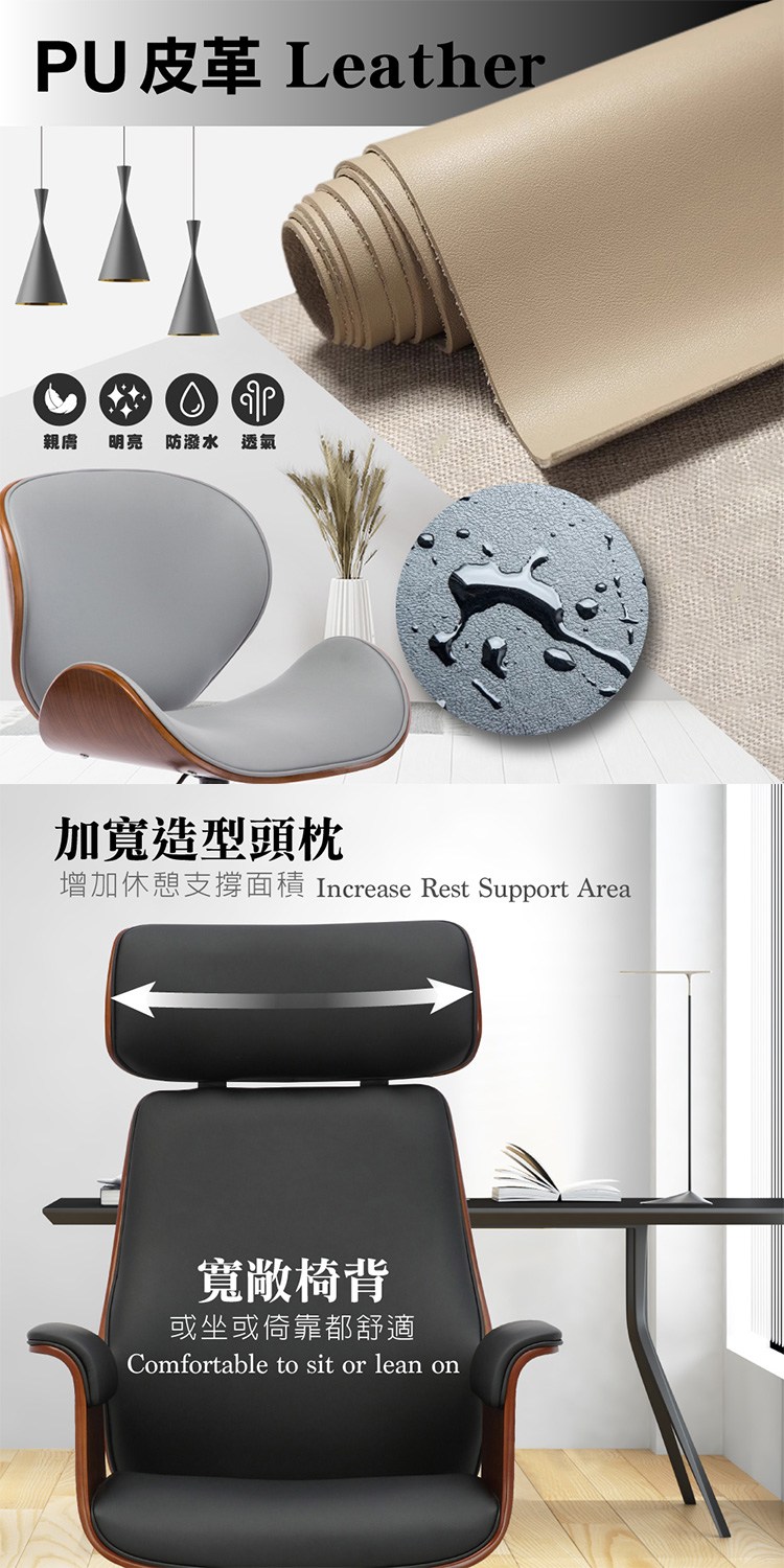 台灣與歐美同步販售、美規設計,防潑水PU皮座面,觸感佳易清潔,加寬造型頭枕增加休憩支撐面積,