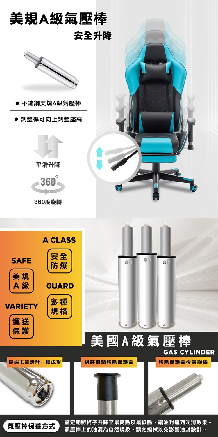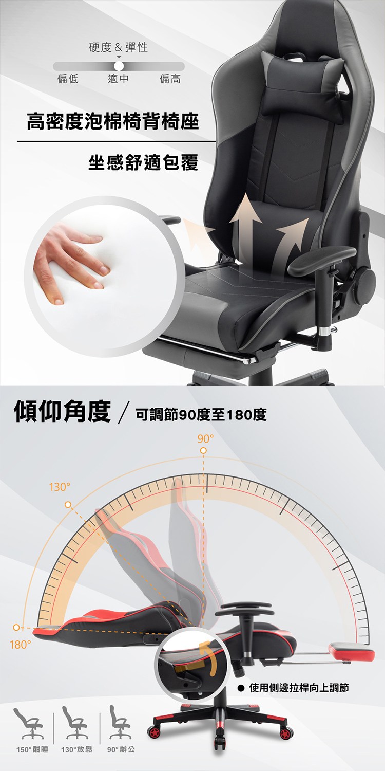 舒適傾仰角度調節90度至180度,配備美規A級氣壓棒、安全升降,含有伸縮腳墊搭配傾仰進行小憩,