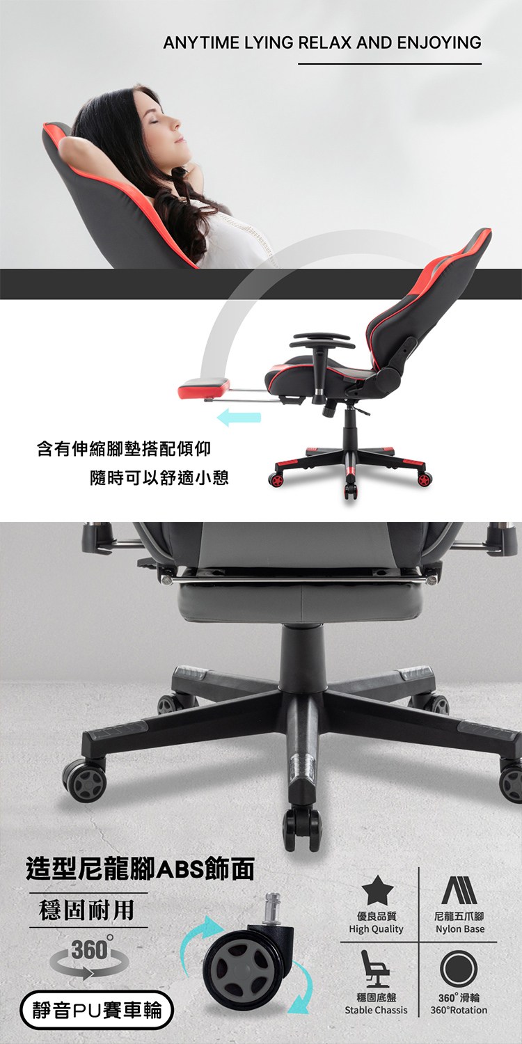 造型尼龍腳ABS飾面、穩固耐用,靜音PU賽車輪、美觀且防刮地板,可以盡情在競速的世界征服所有挑戰。