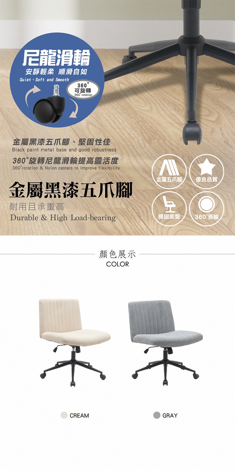 配備美規A級氣壓棒、安全升降,金屬黑漆五爪腳,穩固且承重強,360°旋轉尼龍滑輪、靈活且耐磨,