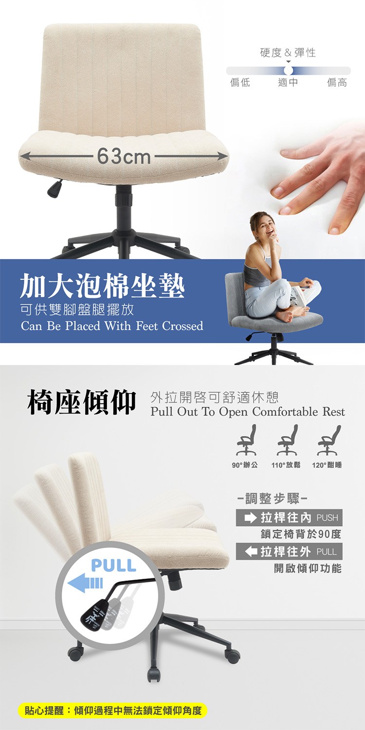 加大泡棉坐墊可供雙腳盤腿擺放,工作之餘放鬆悠閒享受午茶時光,外拉開啟椅背傾仰,可舒適休憩,