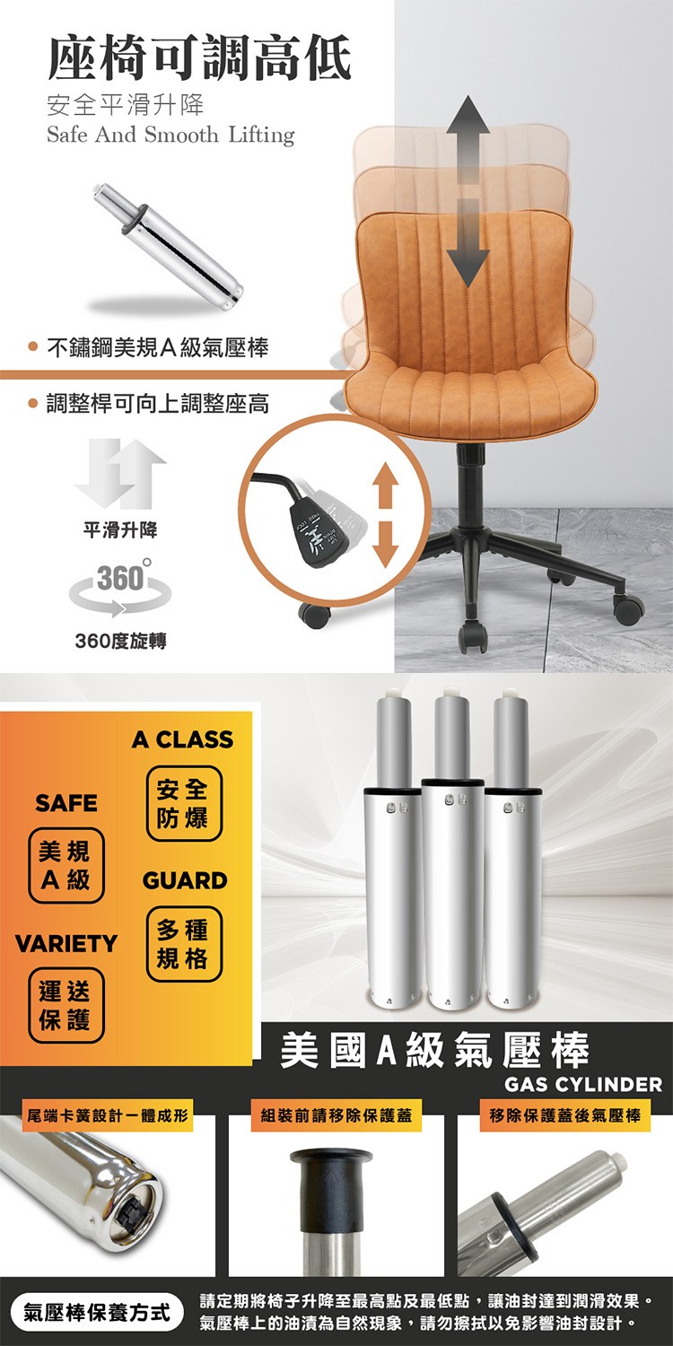 高密度泡棉坐墊坐感彈性支撐佳,外拉開啟椅背傾仰,可舒適休憩,配備美規A級氣壓棒、安全升降,