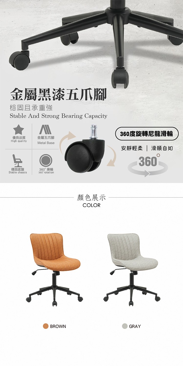 金屬黑漆五爪腳,穩固且承重強,360°旋轉尼龍滑輪、靈活且耐磨,工作之餘放鬆悠閒享受午茶時光。