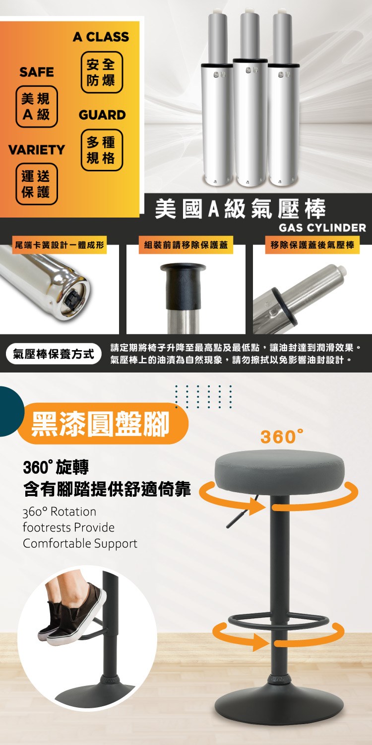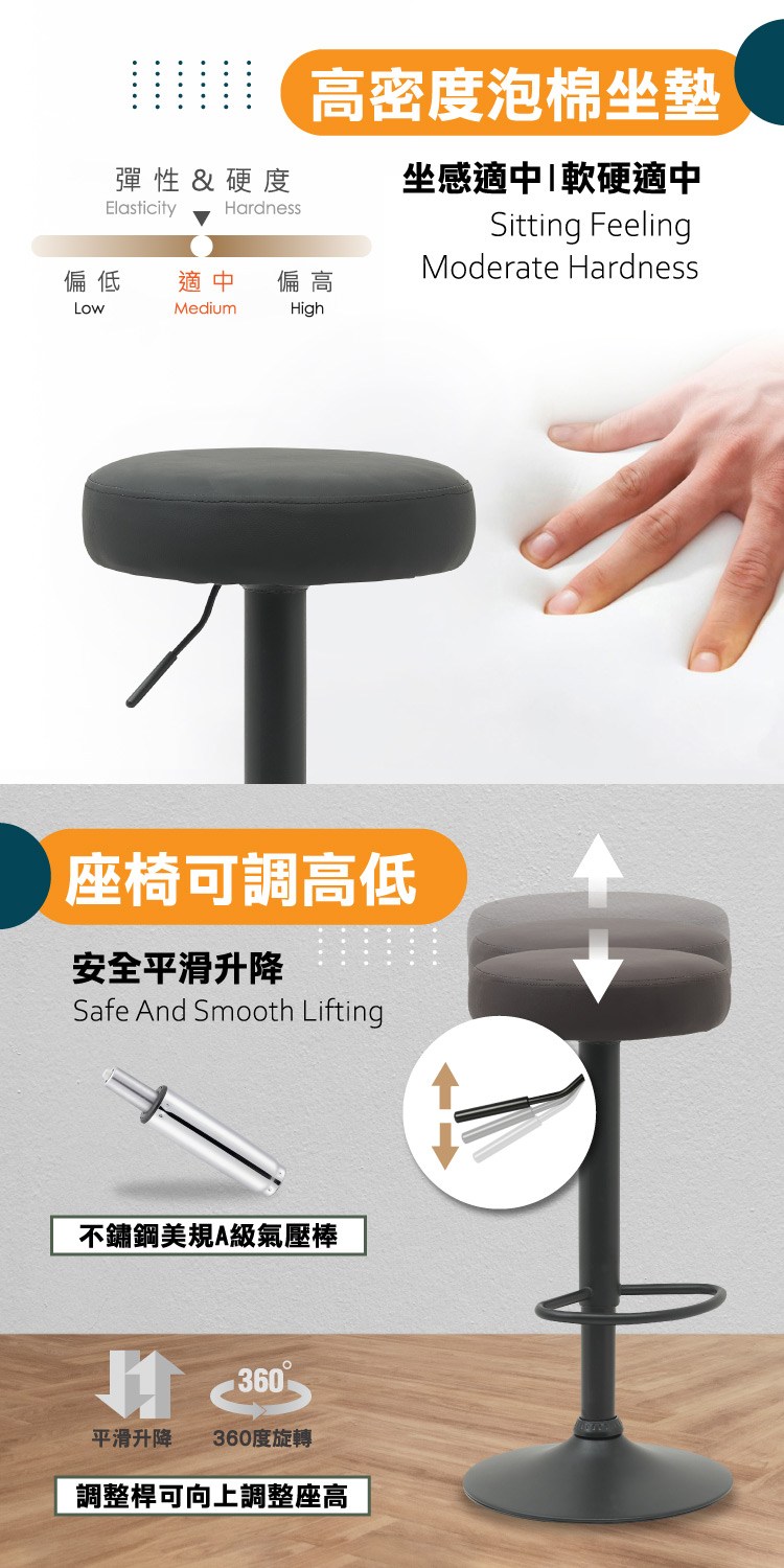 高密度泡棉坐墊讓坐感更加舒適,配備美規A級氣壓棒、安全升降,360°旋轉含有腳踏提供舒適倚靠,