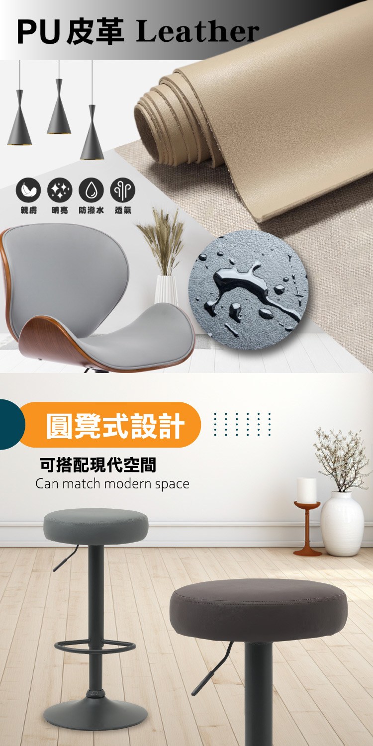 台灣與歐美同步販售、美規設計,防潑水透氣PU皮椅面、易於清潔,摩登圓凳式設計可搭配現代空間,