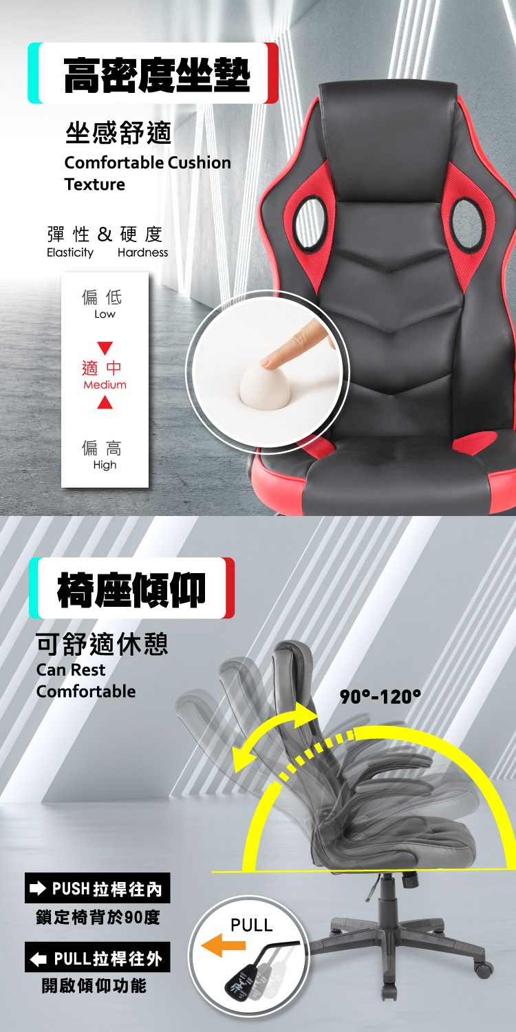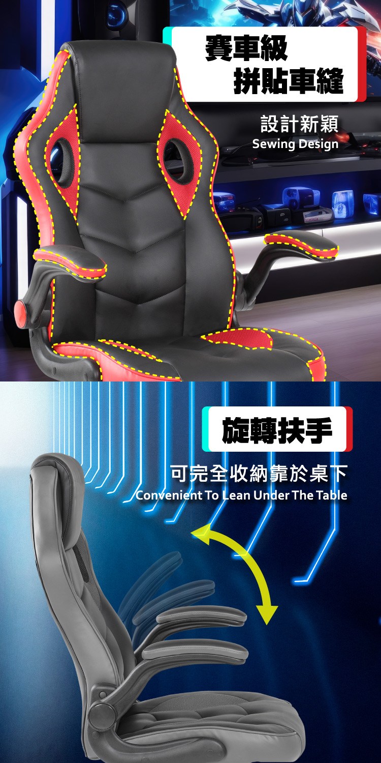 搭配賽車級的拼貼車縫設計新穎,旋轉扶手,可完全收納靠於桌下,椅座採用高密度泡棉、坐感舒適,