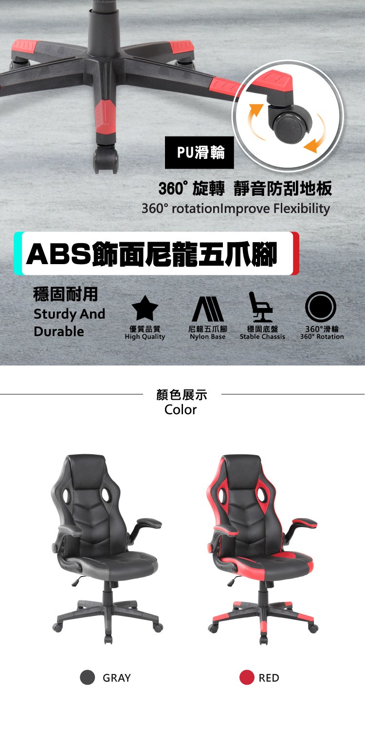 搭配賽車級的拼貼車縫設計新穎,旋轉扶手,可完全收納靠於桌下,椅座採用高密度泡棉、坐感舒適,