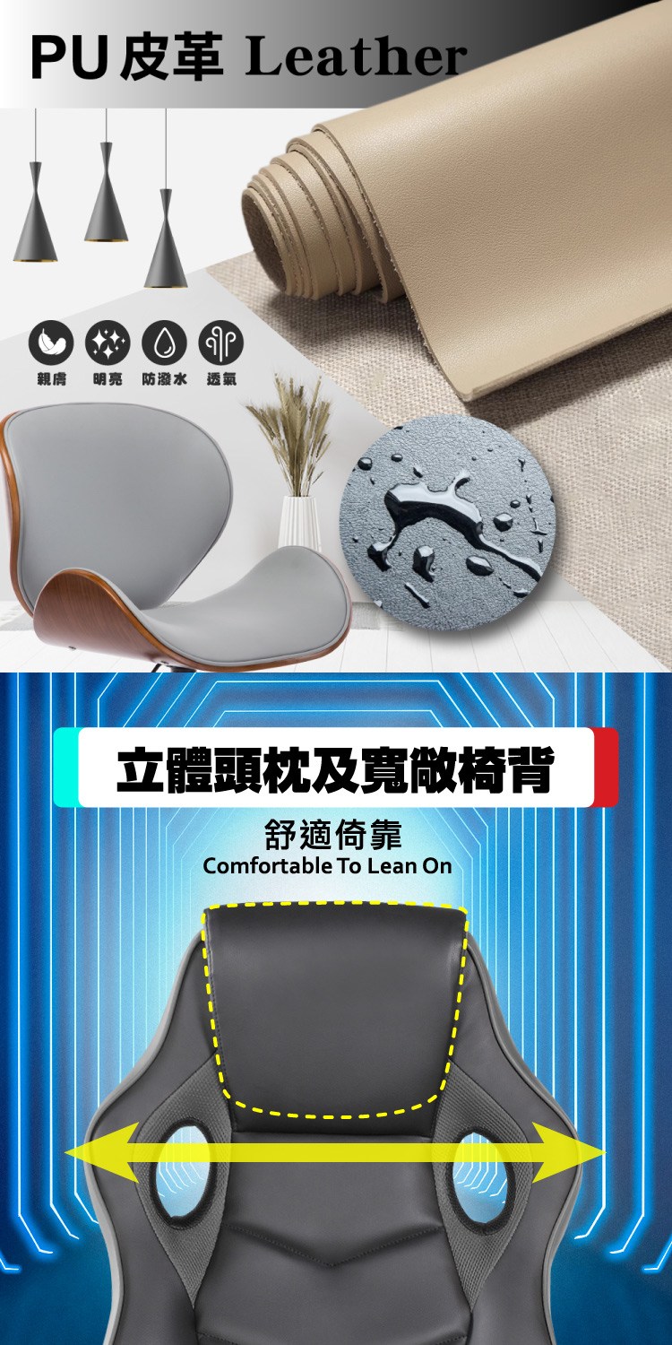 台灣與歐美同步販售、美規設計,防潑水PU椅面、質感透氣又親膚,立體頭枕及寬敞椅背,舒適倚靠,