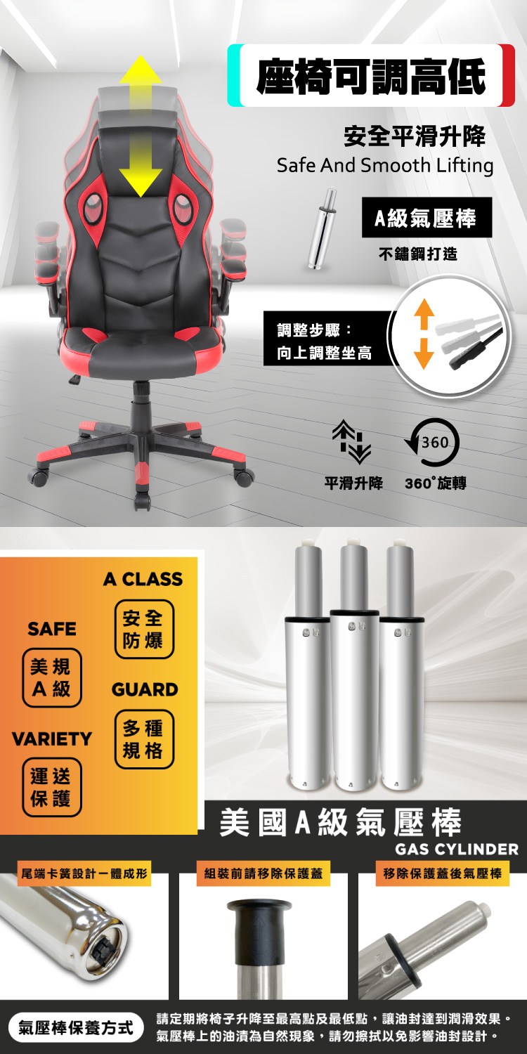 外拉開啟椅座傾仰,可舒適休憩,配備美規A級氣壓棒、安全升降,ABS飾面尼龍五爪腳、穩固耐用,