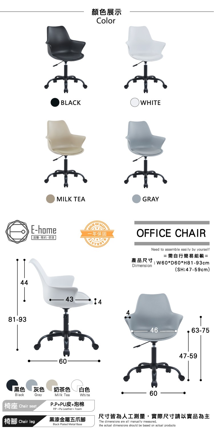 黑漆金屬五爪腳、耐用且承重高,360°旋轉靜音P.U.滑輪靈活移動,簡易組裝、迅速享有舒適的體驗。
