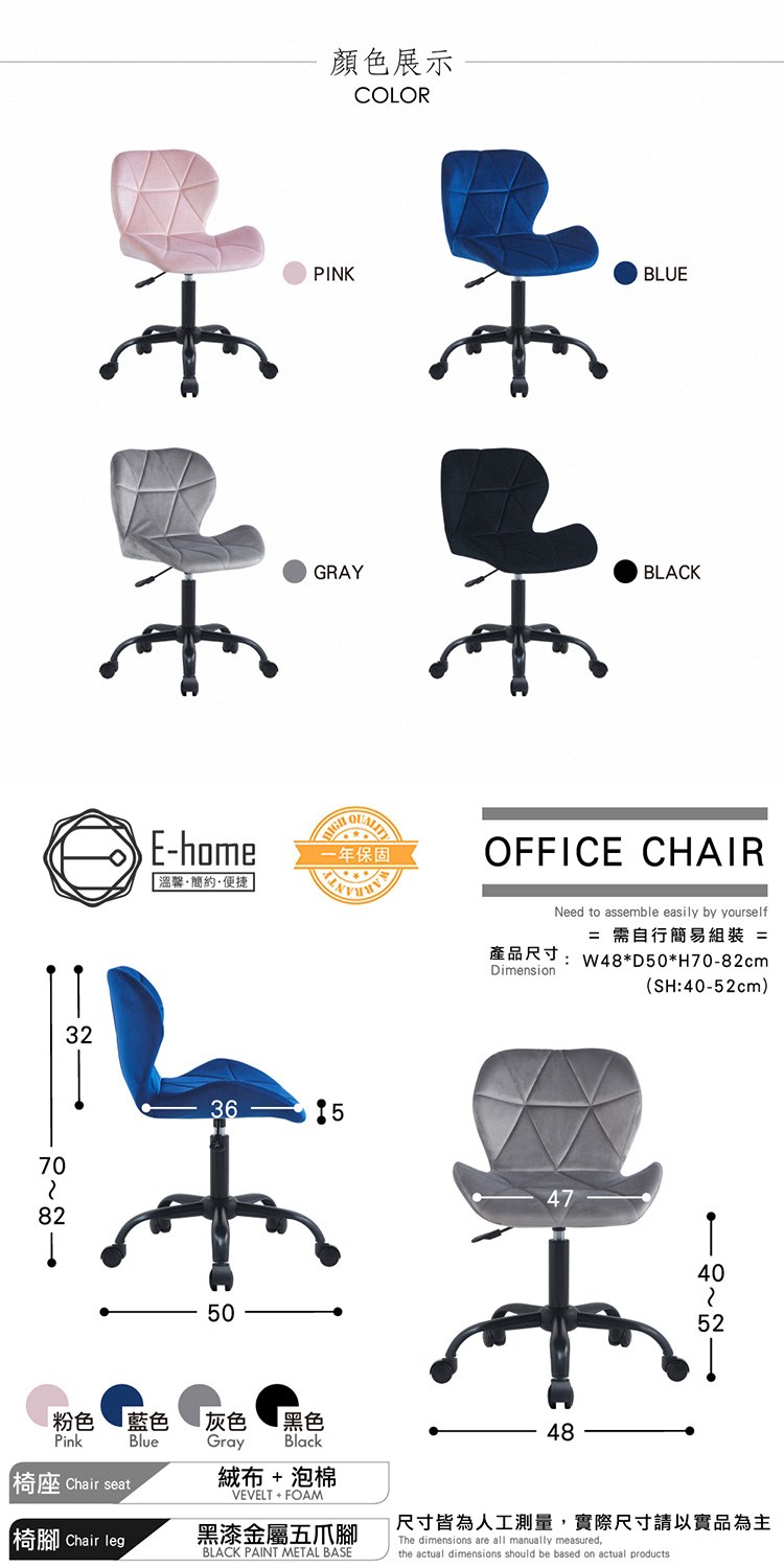 E-home Phyllis菲莉絲造型絨布軟墊黑腳電腦椅-四色可選