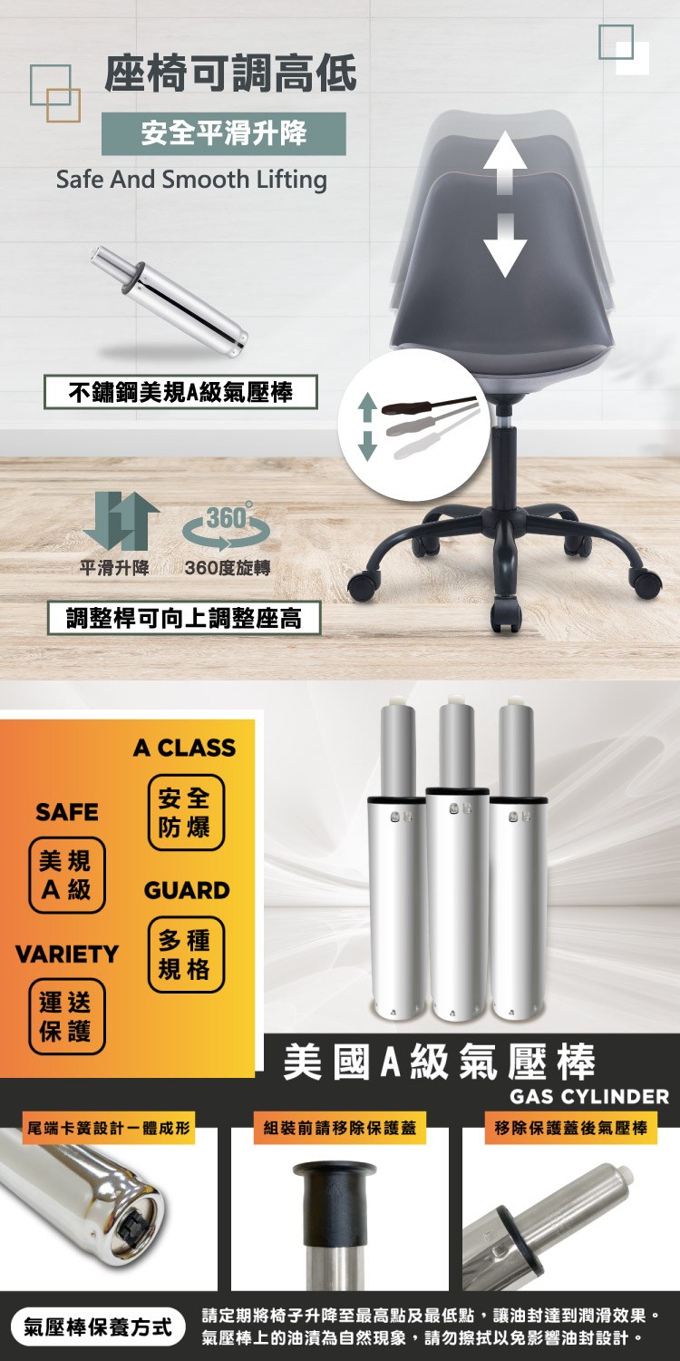 PU皮包覆之泡棉坐墊、坐感適中,配備美規A級氣壓棒、安全升降,黑漆金屬五爪腳、耐用且承重高,