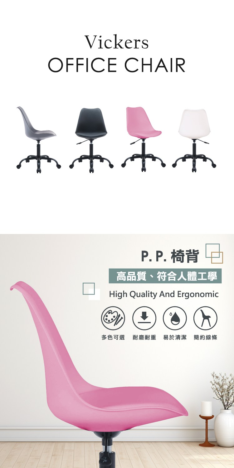 [E-home]Vickers維克斯PP造型軟墊黑腳電腦椅,北歐簡約概念讓您輕鬆擁抱時尚,增添空間耀眼的設計。