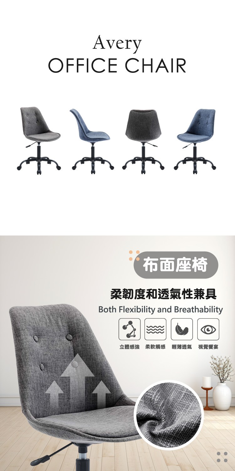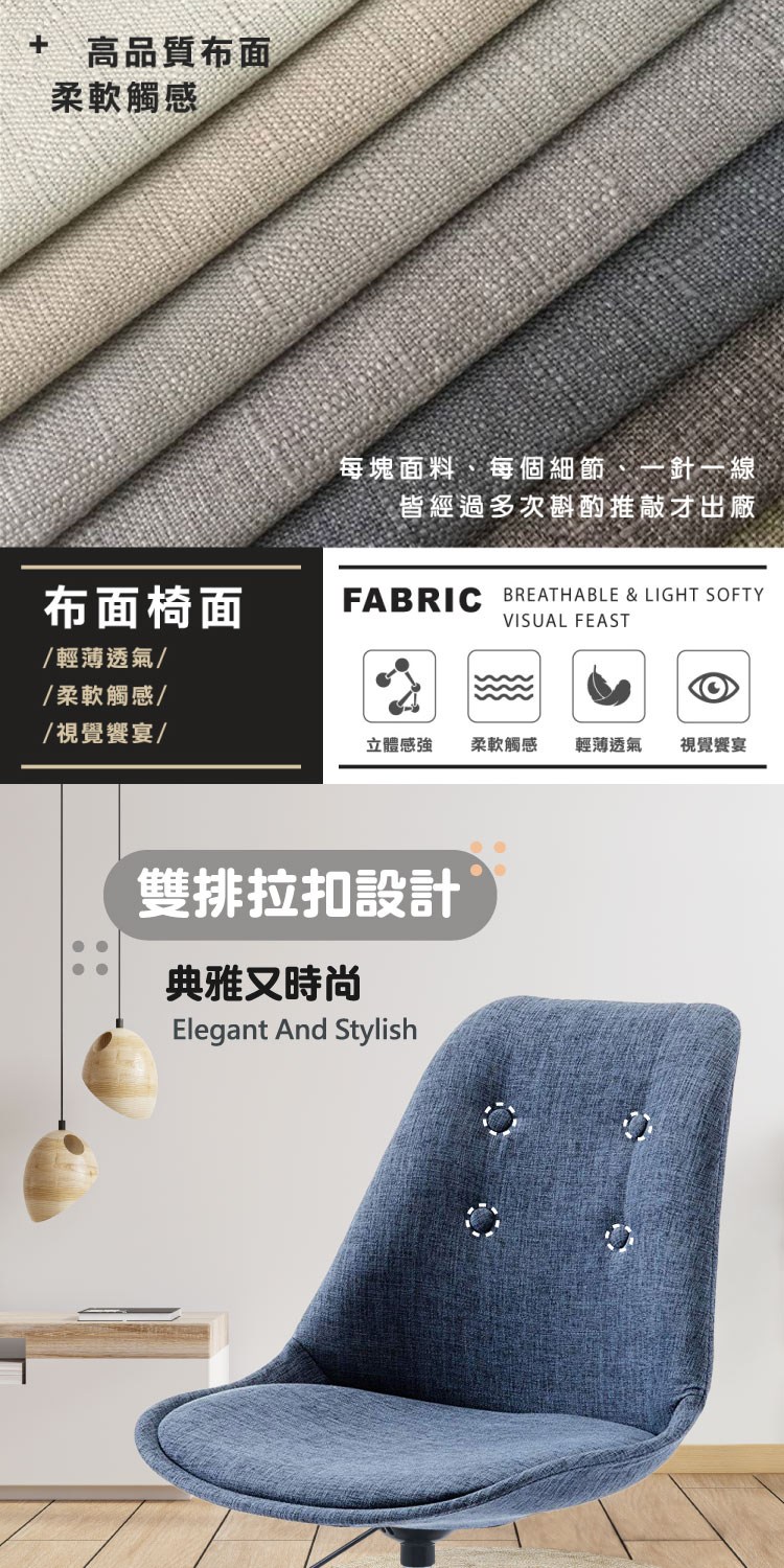 台灣與歐美同步販售、美規設計,柔韌度和透氣性兼具的布面椅座,雙排拉扣椅背設計,典雅又時尚,