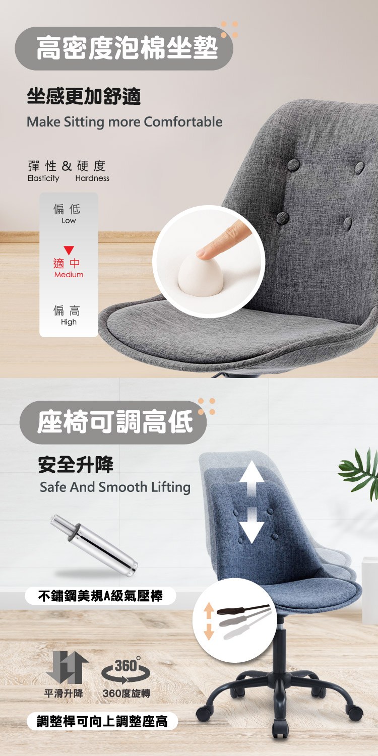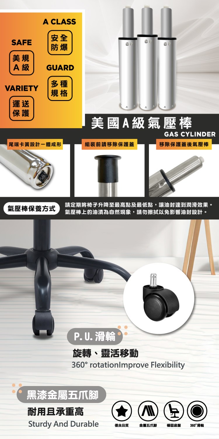 高密度泡棉坐墊讓坐感更加舒適,配備美規A級氣壓棒、安全升降,黑漆金屬五爪腳、耐用且承重高,