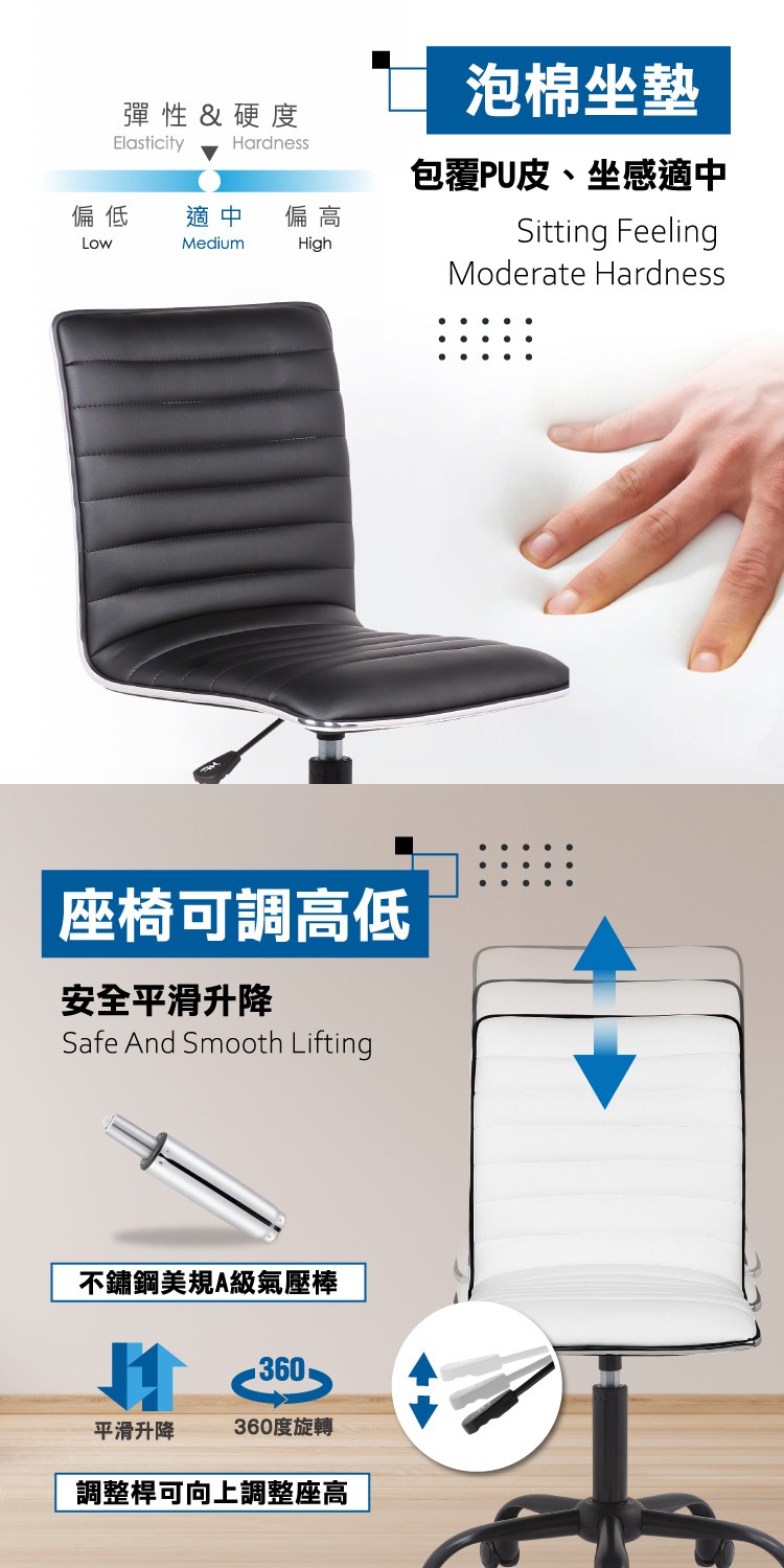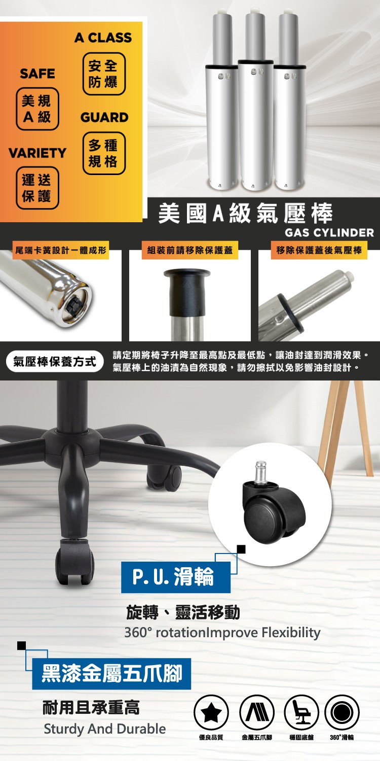 包覆PU皮之泡棉坐墊、坐感適中,配備美規A級氣壓棒、安全升降,黑漆金屬五爪腳、耐用且承重高,