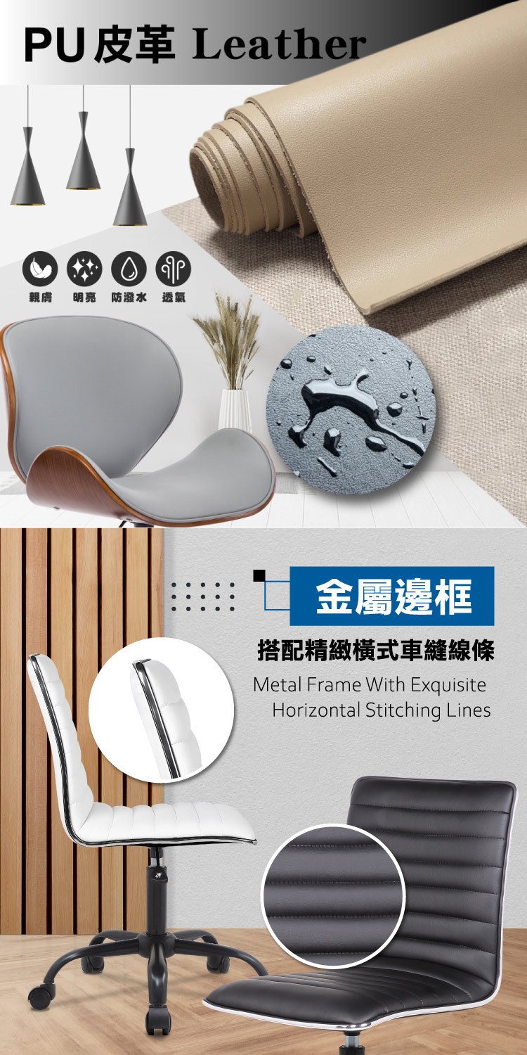台灣與歐美同步販售、美規設計,防潑水PU皮座面,觸感佳易清潔,金屬邊框搭配精緻橫式車縫線條,