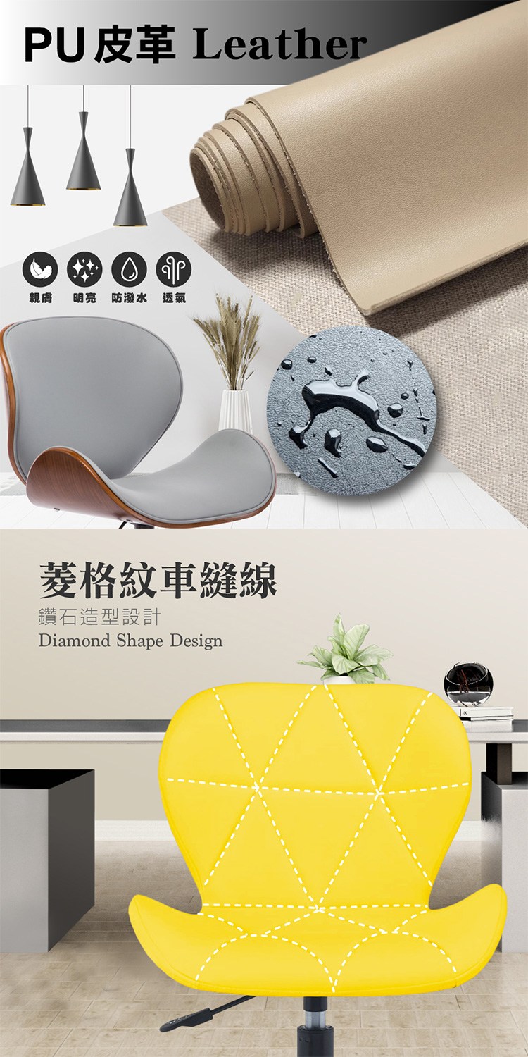 台灣與歐美同步販售、美規設計,防潑水PU皮座面,觸感佳易清潔,鑽石造型設計搭配菱格紋車縫線,