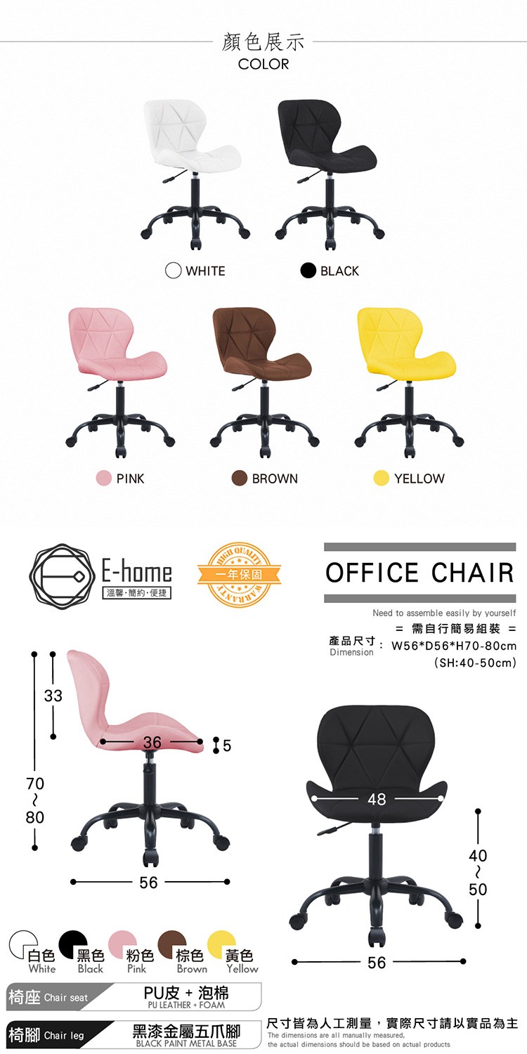 E-home Goffney加夫尼PU軟墊黑腳電腦椅-五色可選