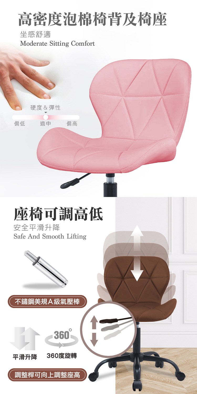 高密度泡棉椅背及椅座坐感舒適,配備美規A級氣壓棒、安全升降,黑漆金屬五爪腳、耐用且承重高,