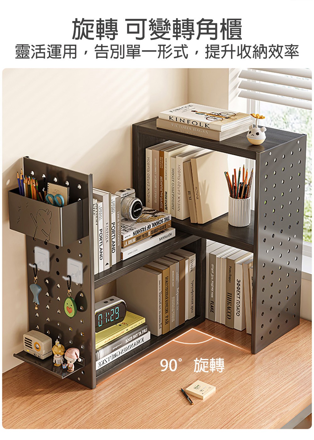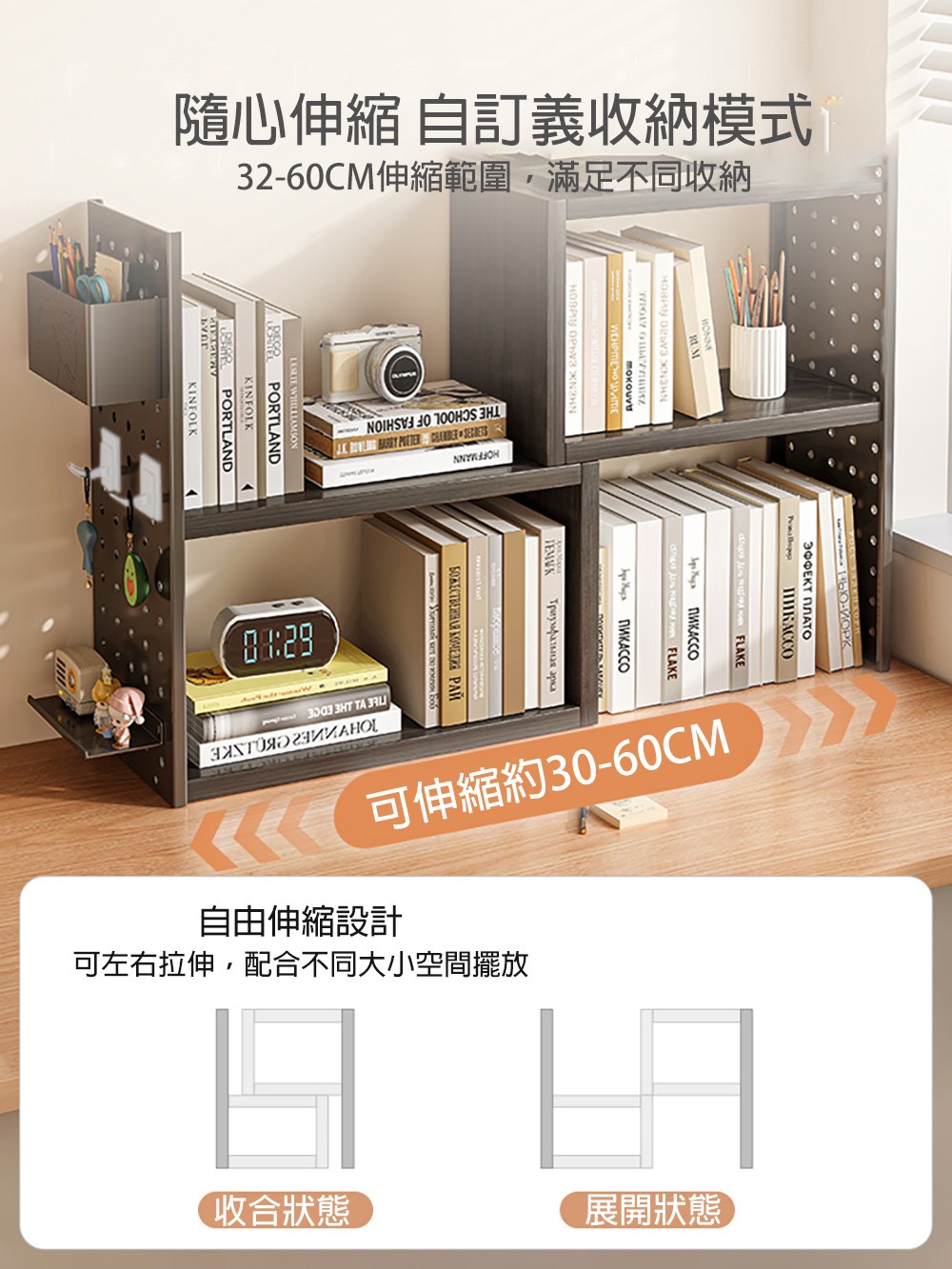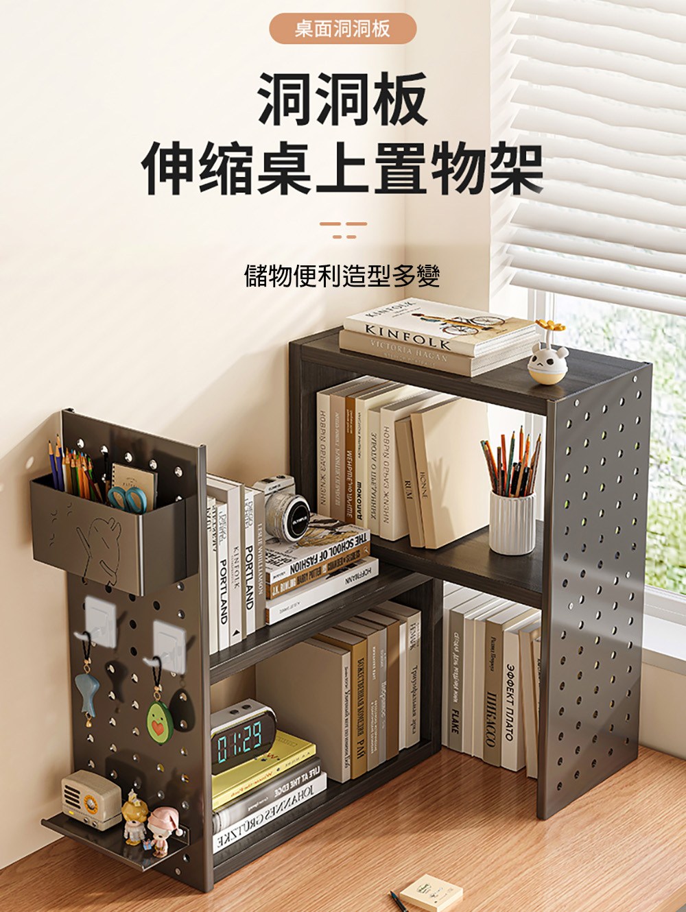 點我下載【居家生活Easy Buy】可伸縮洞洞板收納書架-桌上型(洞洞板架 層架 收納架 書架 置物架)黑支架+黑木板