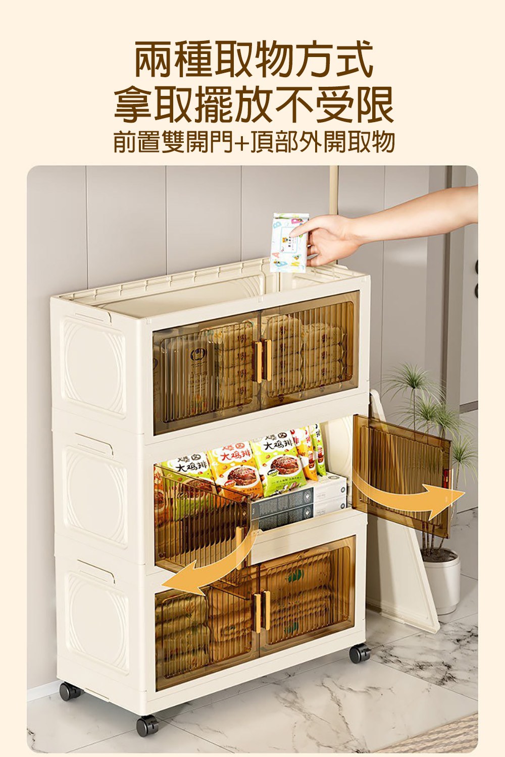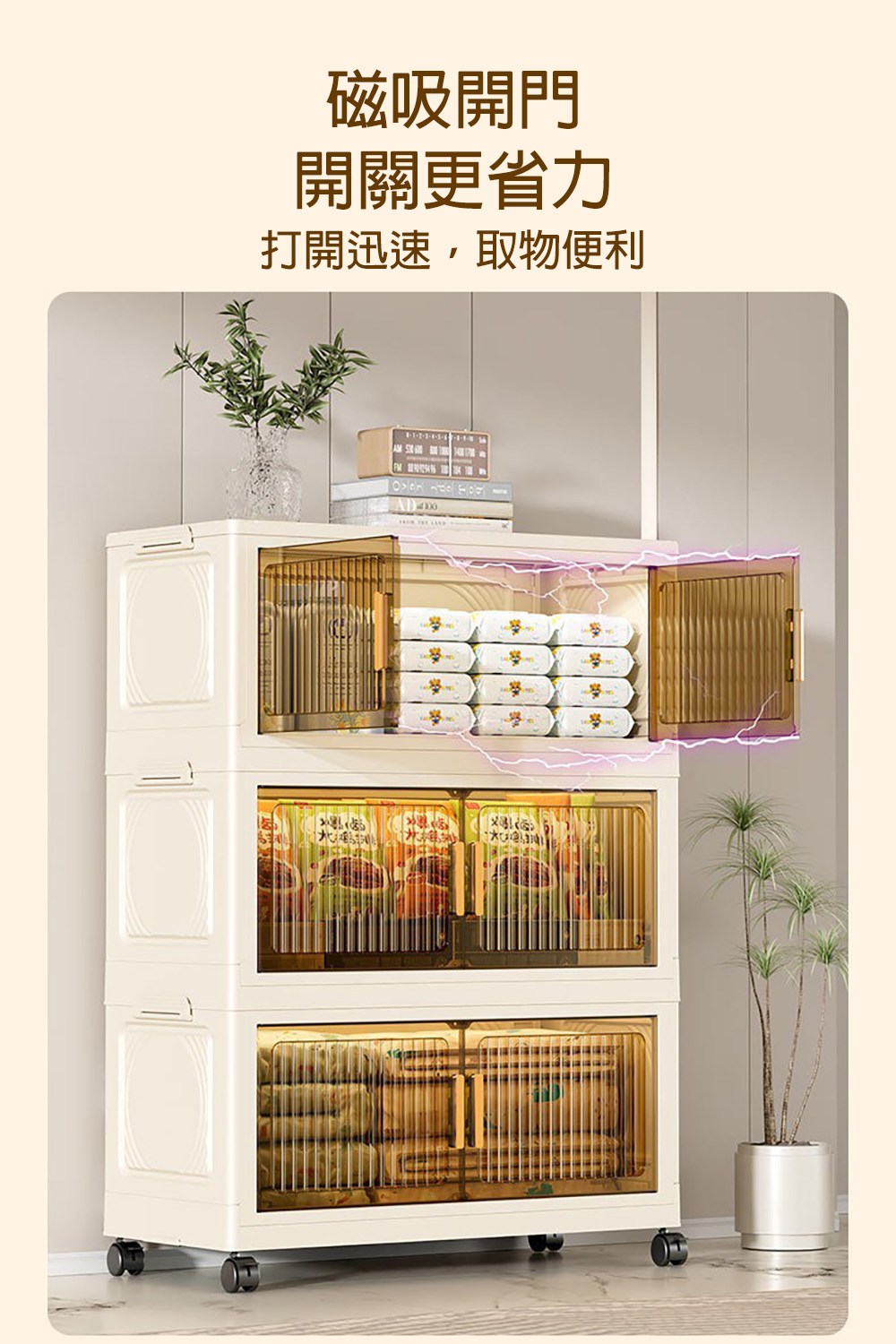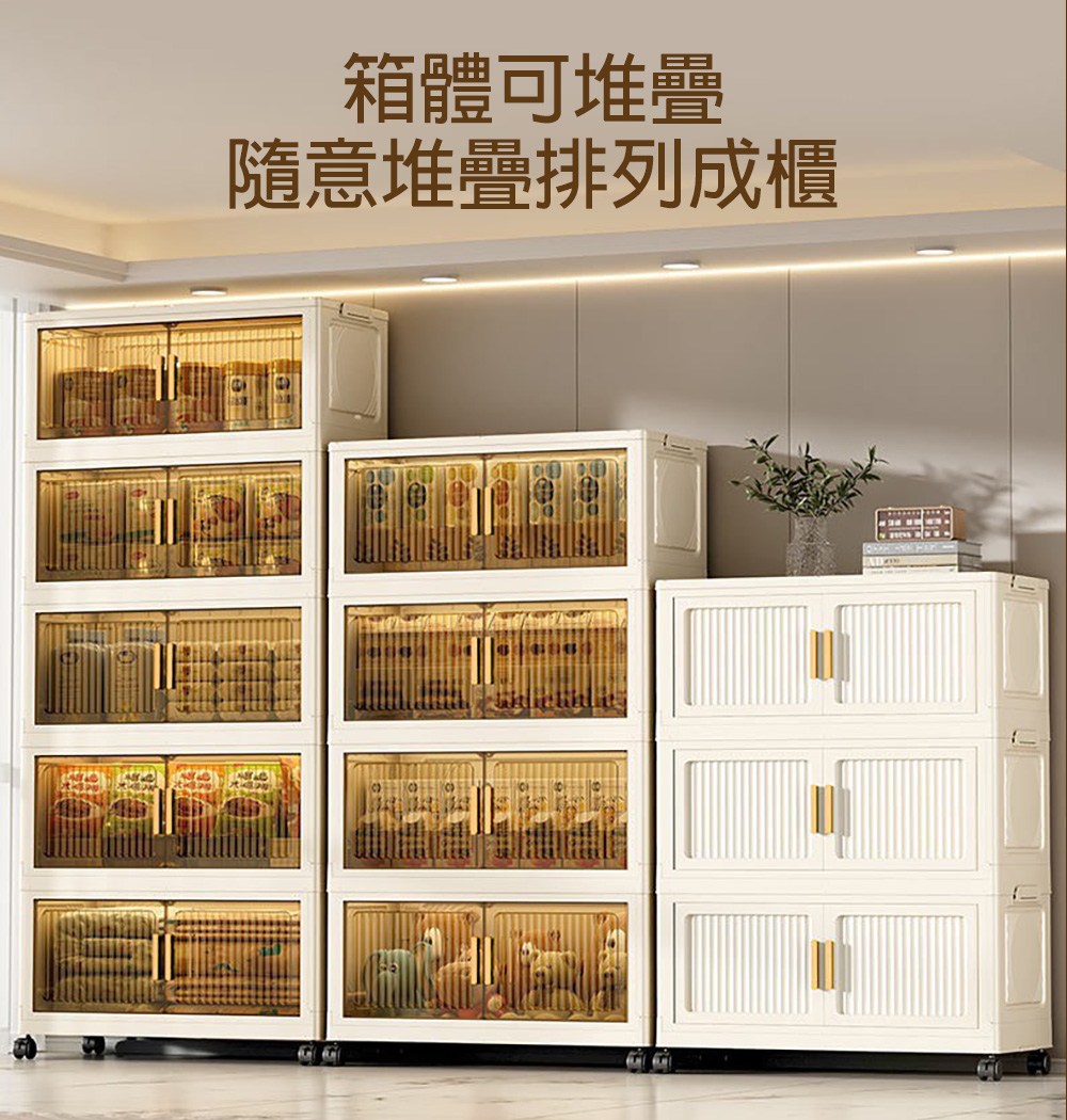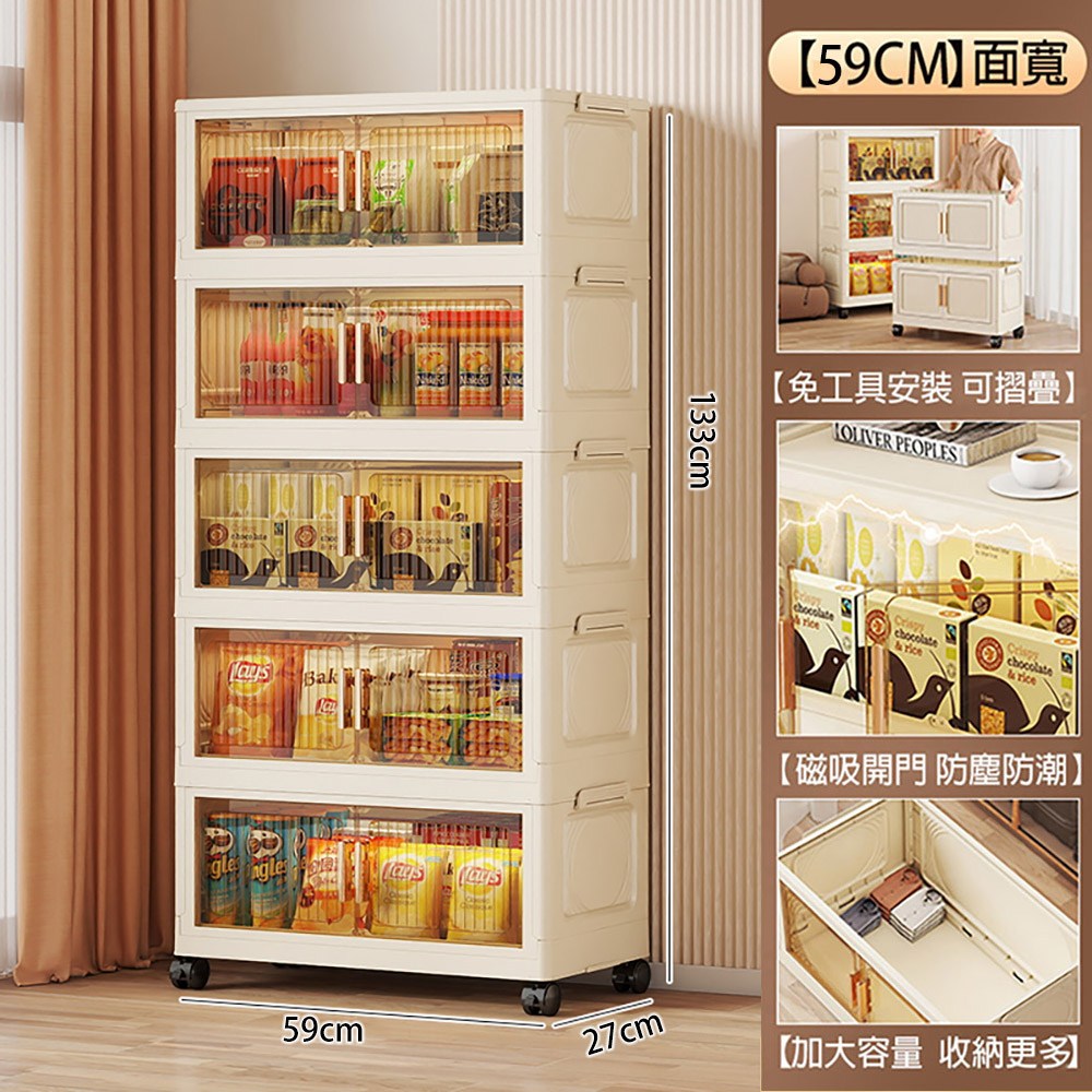 【好氣氛家居】60CM雙開門5層磁吸摺疊帶輪置物收納櫃/置物櫃(抽屜櫃收納箱收納架層透明面板