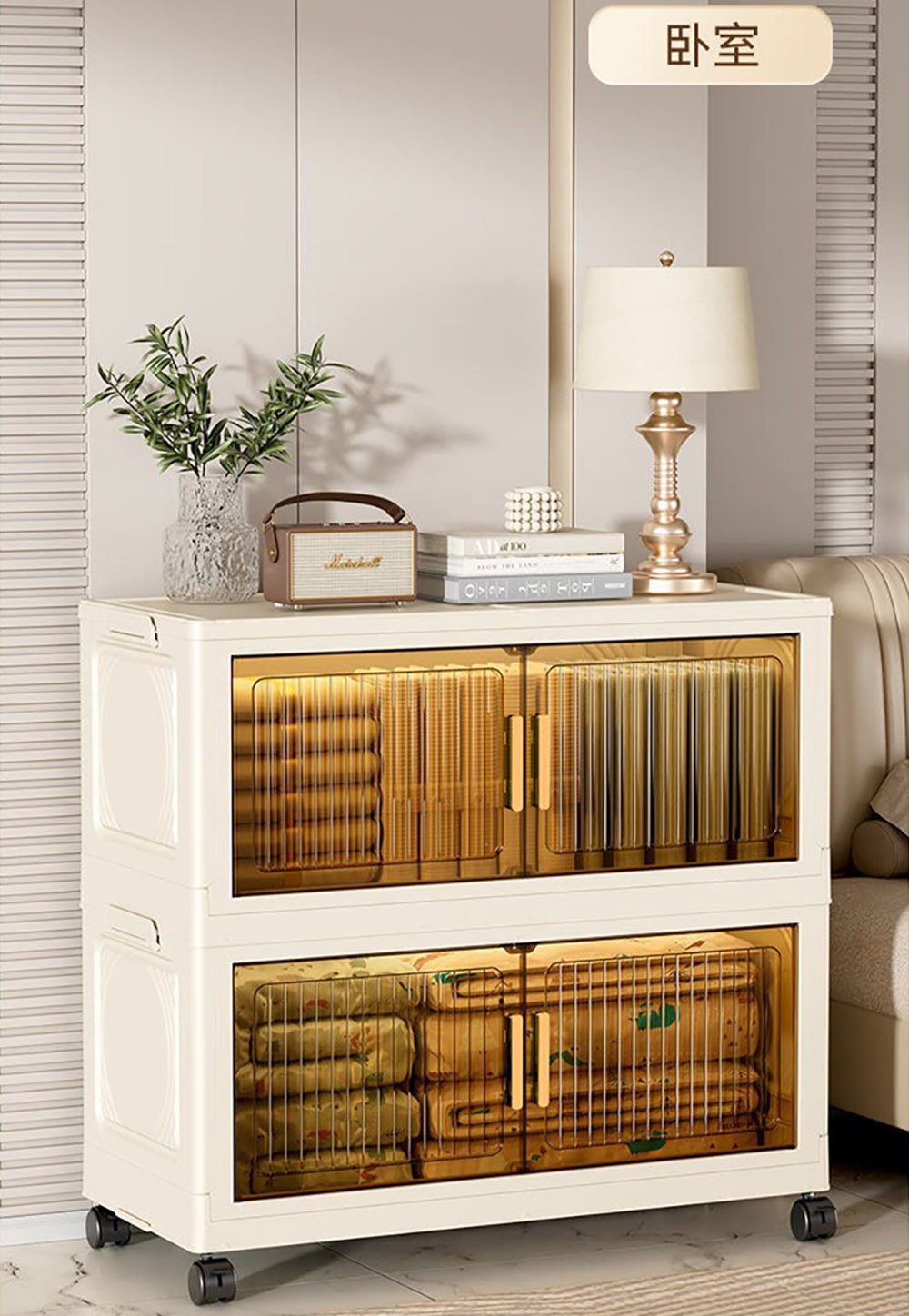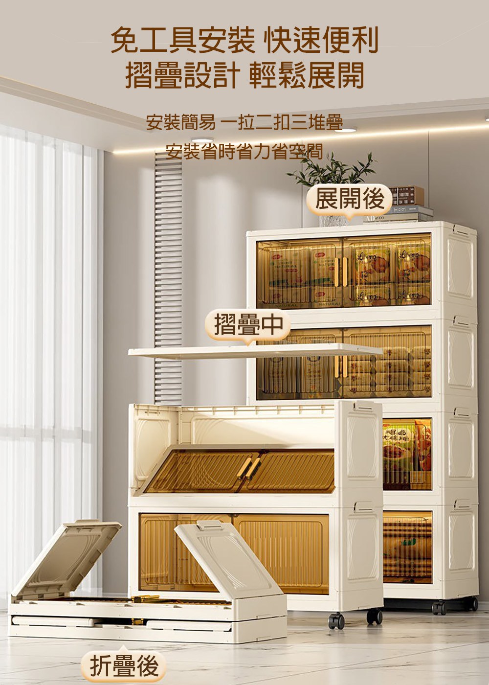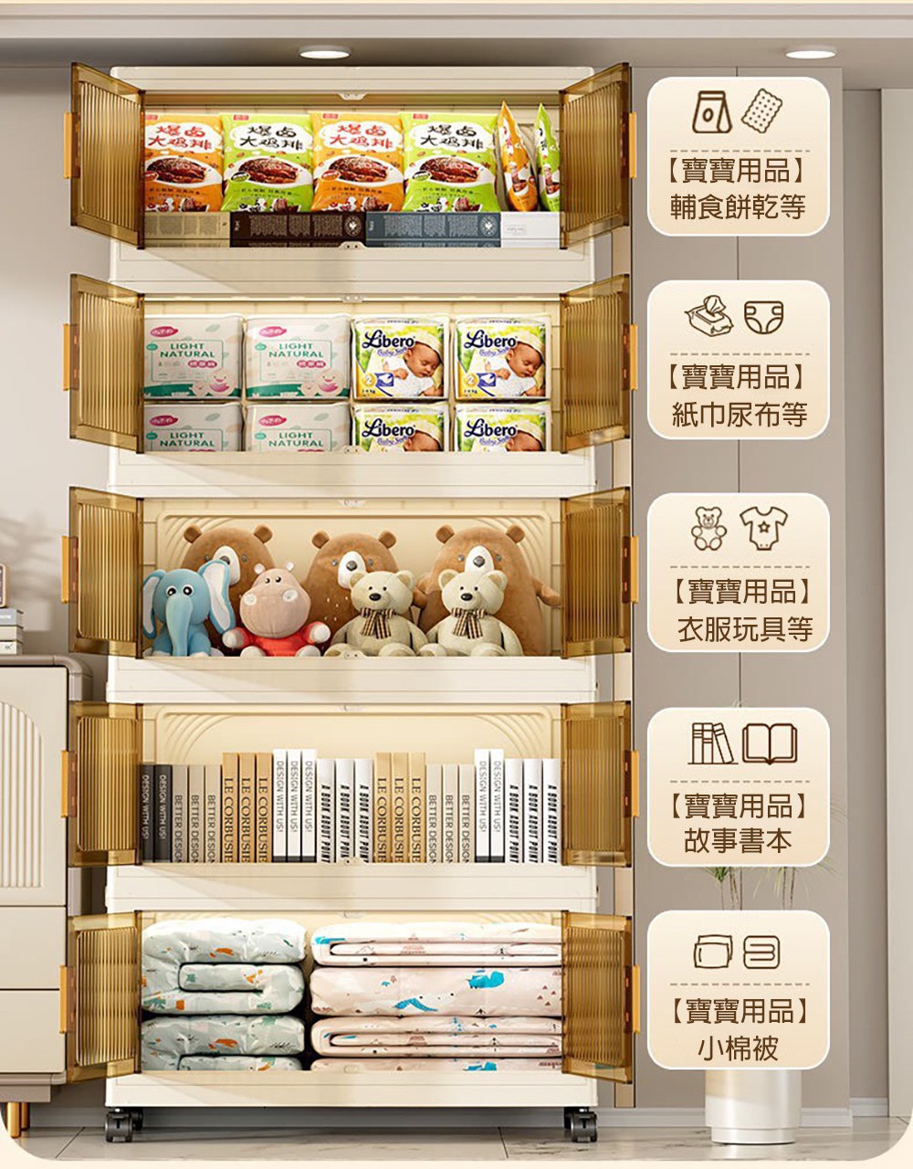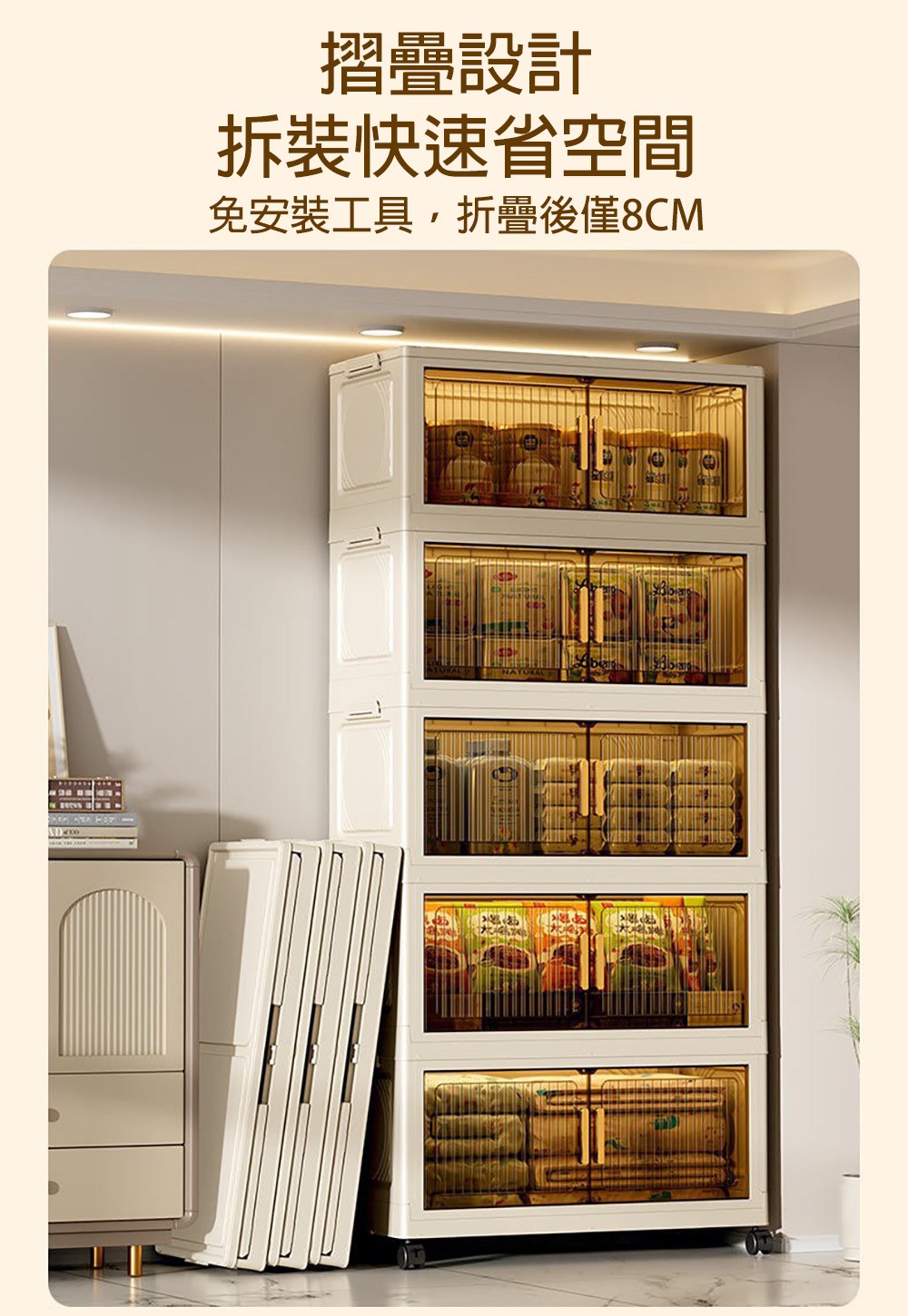 【好氣氛家居】60CM雙開門5層磁吸摺疊帶輪置物收納櫃/置物櫃(抽屜櫃收納箱收納架層透明面板