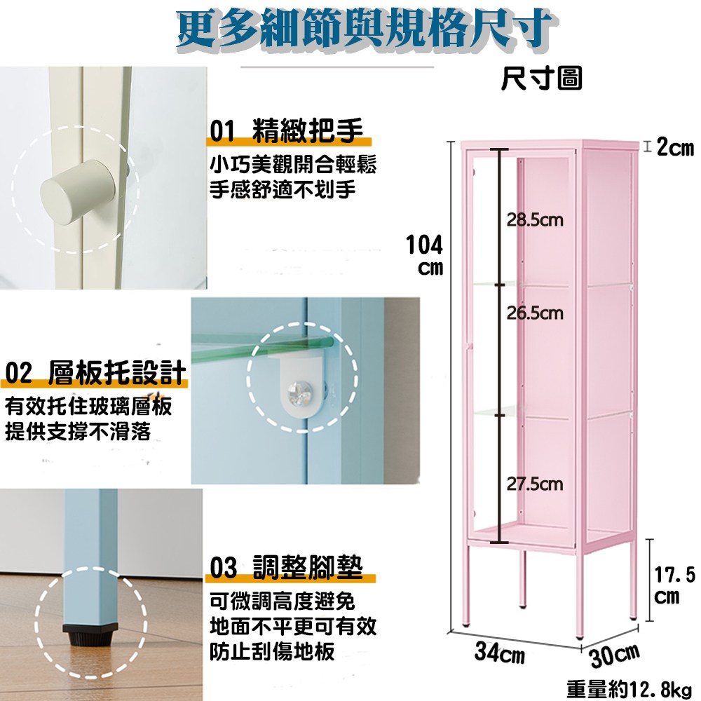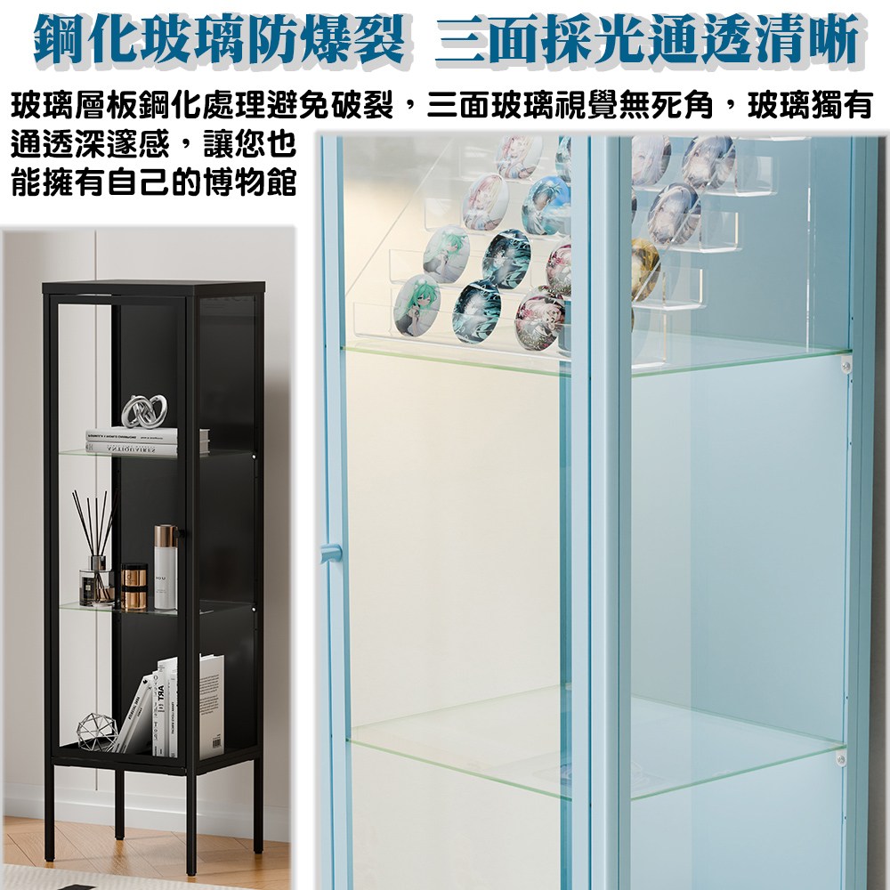 採用優質冷軋鋼板,外表輔以先進環保的靜電粉體塗裝處理,無毒無甲醛,作工精緻穩固耐用。穿透力十足的三面採光,左右側板與門板都是鋼化玻璃,視覺無阻礙光線更明亮,可270度環視您的心愛收藏品,超有質感的櫃門把手,開關皆便利。共有兩塊鋼化玻璃層板,厚度4mm耐重佳且層板高度可以調整,讓內部收納高度可以符合您的需求,無論大公仔模型、布偶潮玩娃娃或徽章立牌都不會浪費收納空間,即使放置餐具、紅酒或書本也沒問題。