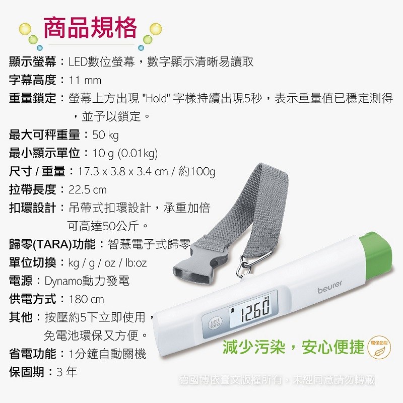博依 beurer LS20 環保免電池行李秤重計