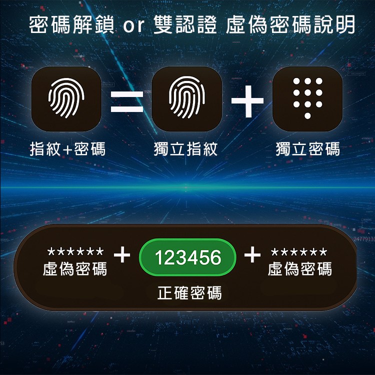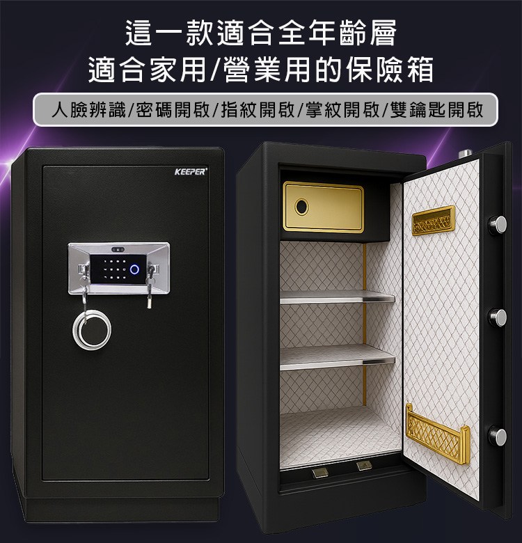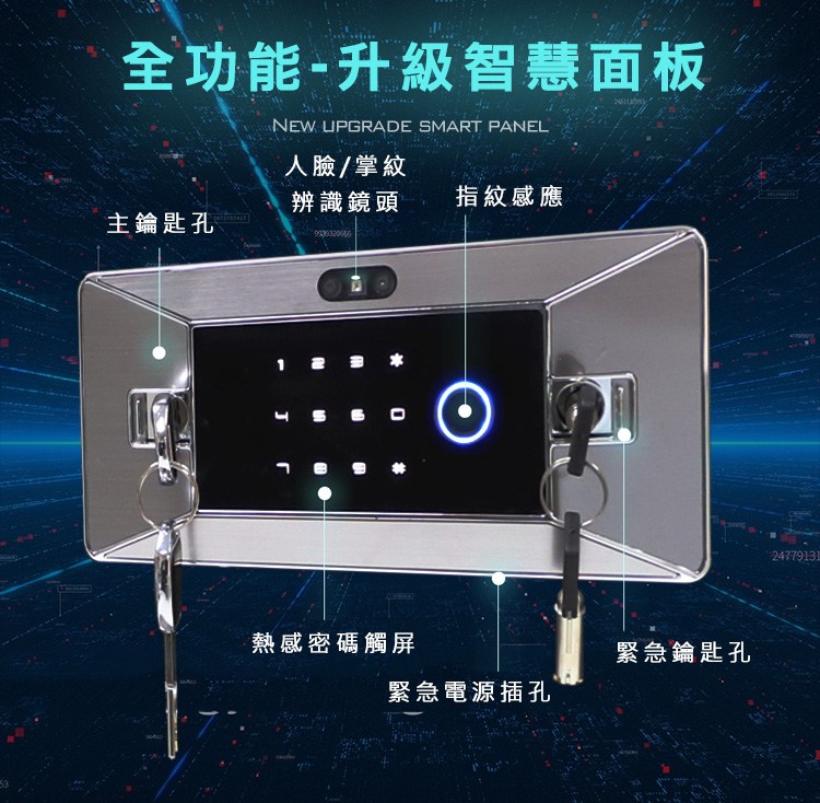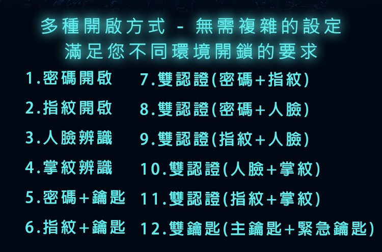 開鎖方式:人臉辨識、掌紋辨識、指紋、密碼、鑰匙、雙鑰匙