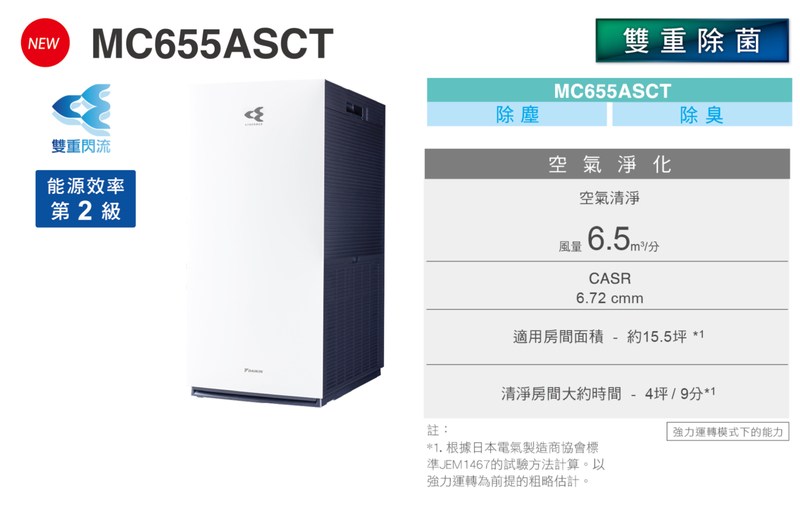DAIKIN 15坪雙重閃流除菌空氣清淨機 MC655ASCT