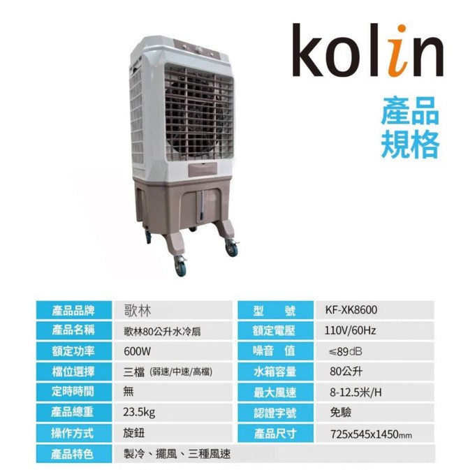 Kolin 歌林 80公升 水冷扇 KF-XK8600