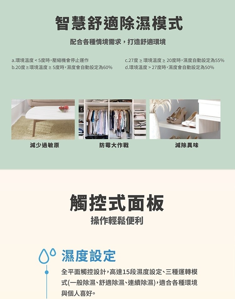 ◆3種運轉模式(一般除濕、舒適除濕、連續除濕),配合各種情境需求
