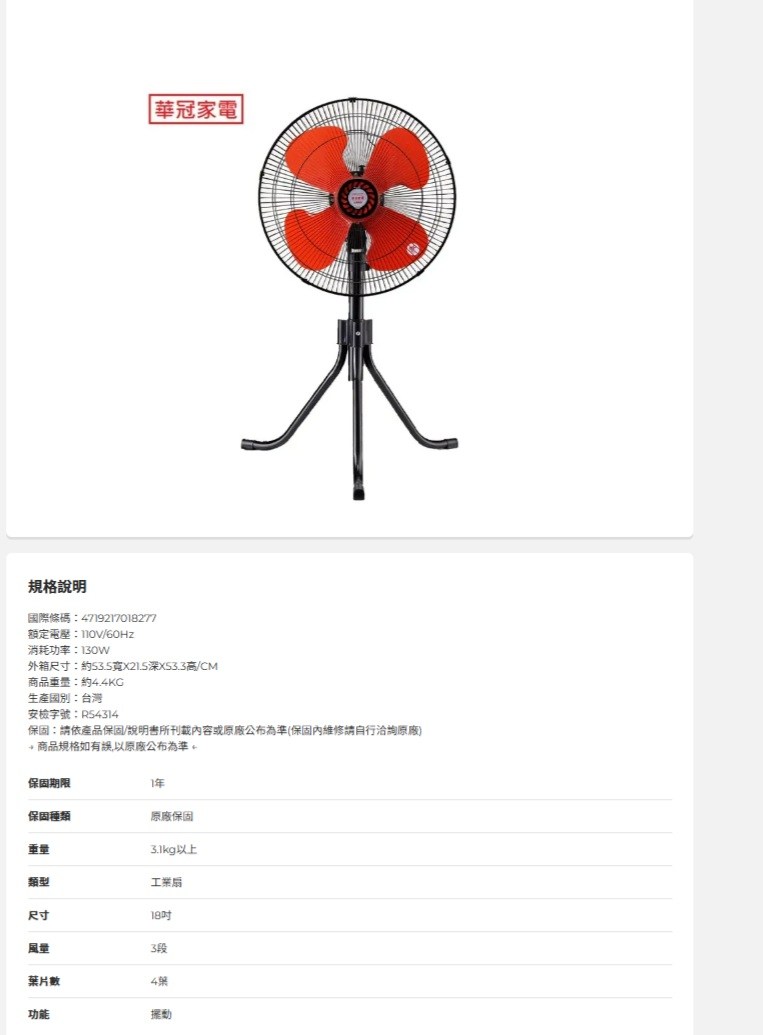 夏天必備 免運 小家電精選 [領劵折50]【史代新文具】華冠 FT-186 18吋 鋁葉工業電扇 (三支高腳)