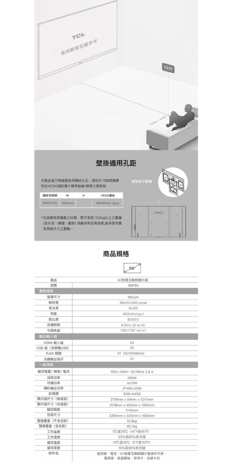 TCL 98型 QLED 144Hz Google TV 量子點智能聯網顯示器 98P8K 含基本桌面安裝舊機回收
