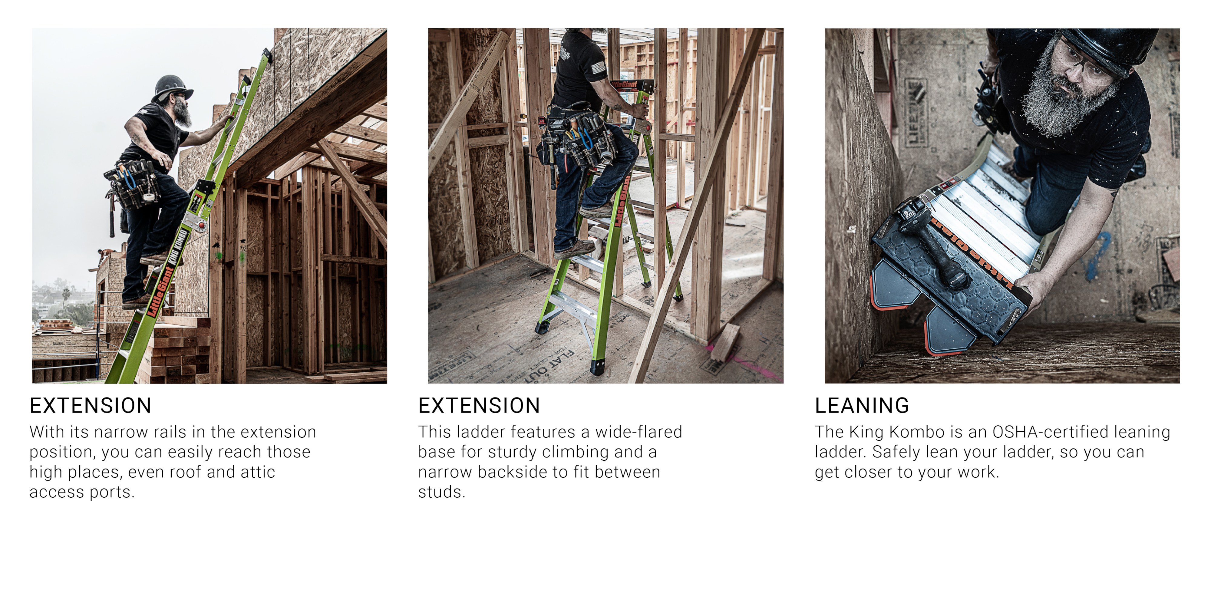 具備【直立延伸梯】、【A字梯】與【靠牆梯】三種模式,快速應對不同工作需求。