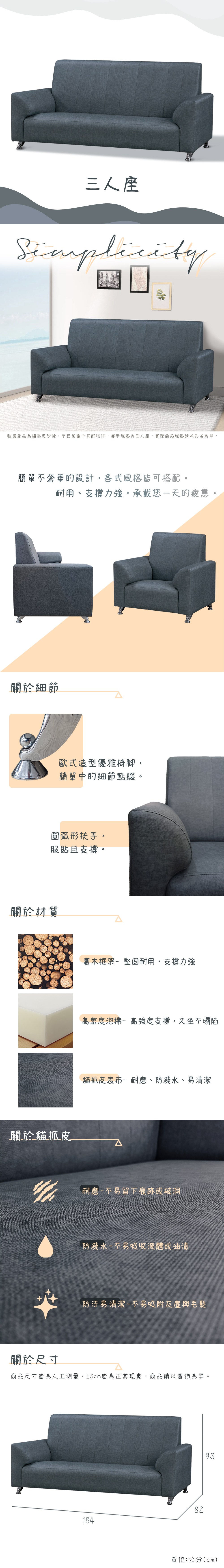 綠活居 雷凱時尚灰亞麻耐磨皮革三人座沙發椅-187x84x88cm免組