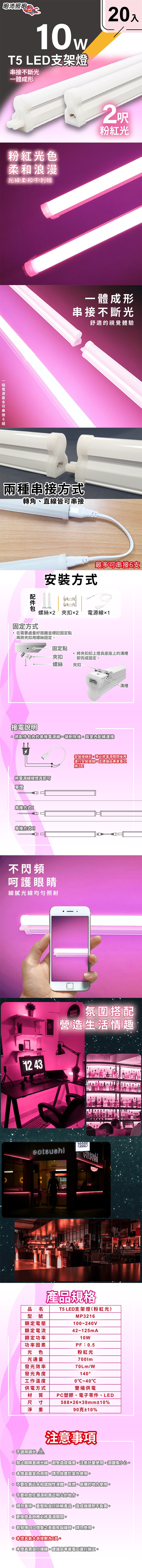 【明沛】10W T5 LED 2呎支架燈 粉紅光 MP3216 (10入組)