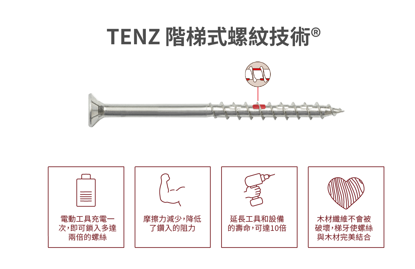 降低摩擦所產生的阻力,鑽進螺絲所需的扭力與能量就自然地變少。TENZ 階梯螺紋技術®具有以下優點: